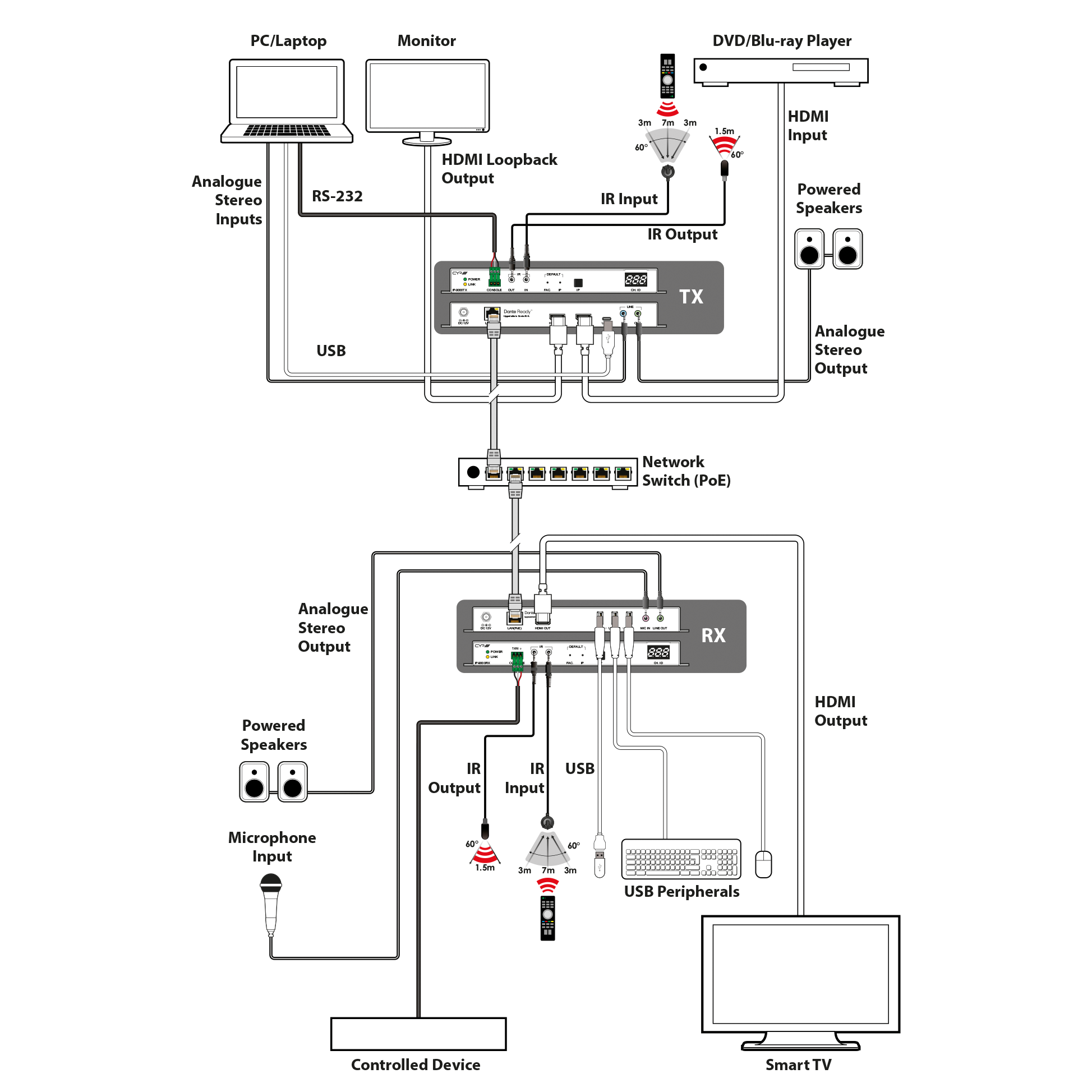 Systemet har också dubbelriktad IR- och RS-232-genomgång, analog in-/utgång på linjenivå och en mikrofoningång (på mottagaren), vilket ger användaren en mängd olika ljudalternativ. USB-funktionen gör att systemet kan fungera som en USB-hubb på distans, vilket i kombination med HDMI-ingång/utgång ger en omfattande plattform för USB över IP-funktionalitet. Konfigurationsinformation tillhandahålls via OSD (On Screen Display) och styrningen sker via WebGUI, IP Master Controller eller Telnet.
