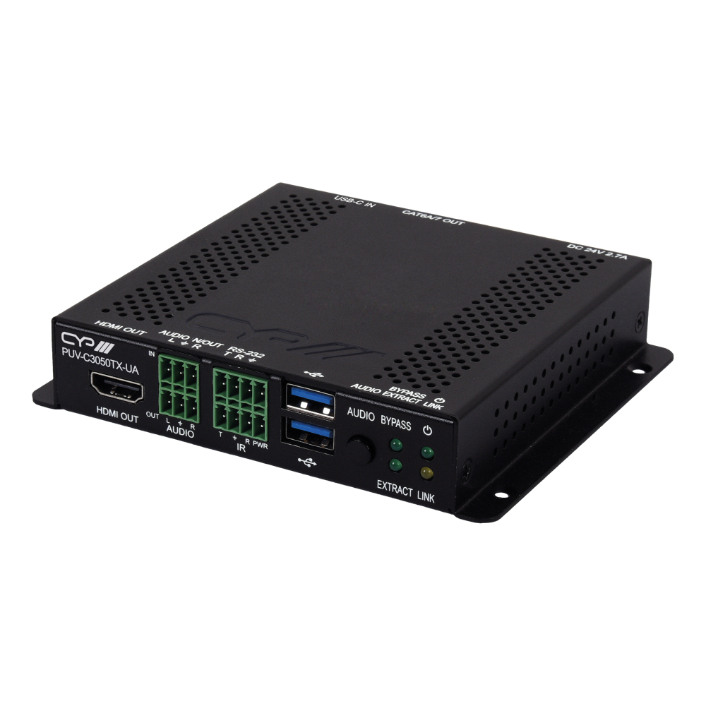Den här sändaren kan överföra okomprimerad USB-C-video (HDMI 2.0 4K@60 4:4:4, 8-bit eller 4K HDR) och HD-ljud samt styrsignaler via en enda Cat.6a/7-kabel på avstånd upp till 40 meter. Flera styr- och datasignaler kan också överföras tillsammans med ljud och bild, inklusive IR, RS-232 och USB 2.0. PUV-C3050TX-UA har också en lokal HDMI-utgång som speglar dess ingång.