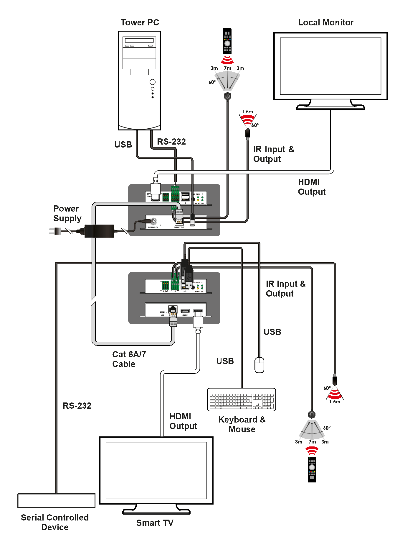 - HDBaseT feature support: HD Video and Audio, PoH (PSE), Bi-directional audio (analogue), and Control (bi-directional USB/IR/RS-232 pass-through)