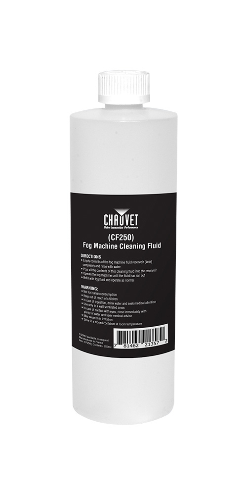Chauvet CF250 är en 250ml rengöringsvätska för rök- och haze-maskiner som är avsedda för vattenbaserade rökvätskor, rensar då maskinen börjar bli tilltäppt.