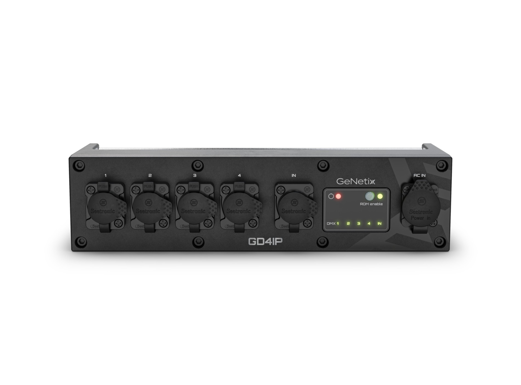GeNetix GN4IP är kompakt IP-klassad DMX-splitter med in / thru och fyra utgångar, anpassad för trossmontage (M12 gänga). RDM-kompatibel, med som kan kopplas ur. Levereras med kabelställ (TRUE1-kompatibel) med open end / pigtail utan stickpropp.