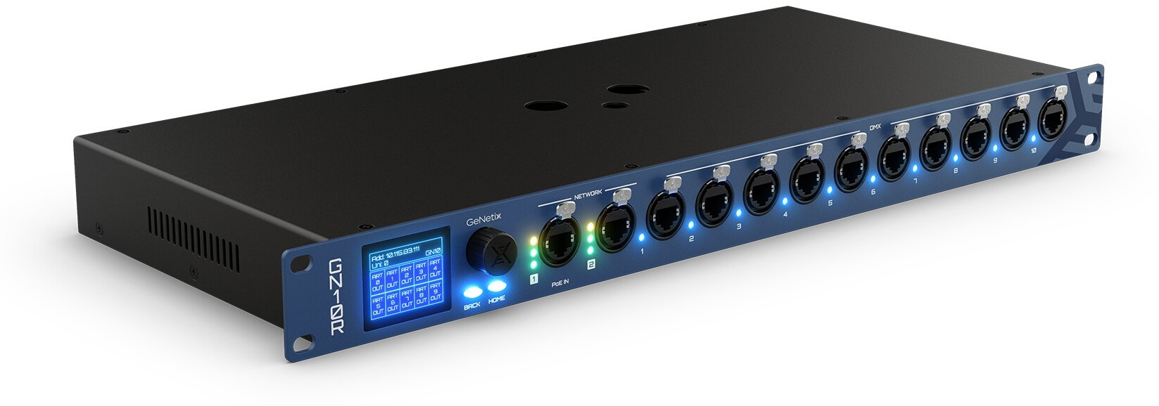 GeNetix GN10P är en 10-portars node: Funktionen är flexibel och alla portar är figurerbara som in- eller utgångar. RDM-kompatibel och hanterar DMX, sACN och Art-Net protokoll. Dessa inställningar görs via enhetens display eller direkt över ett nätverk från ett Chamsys-bord.