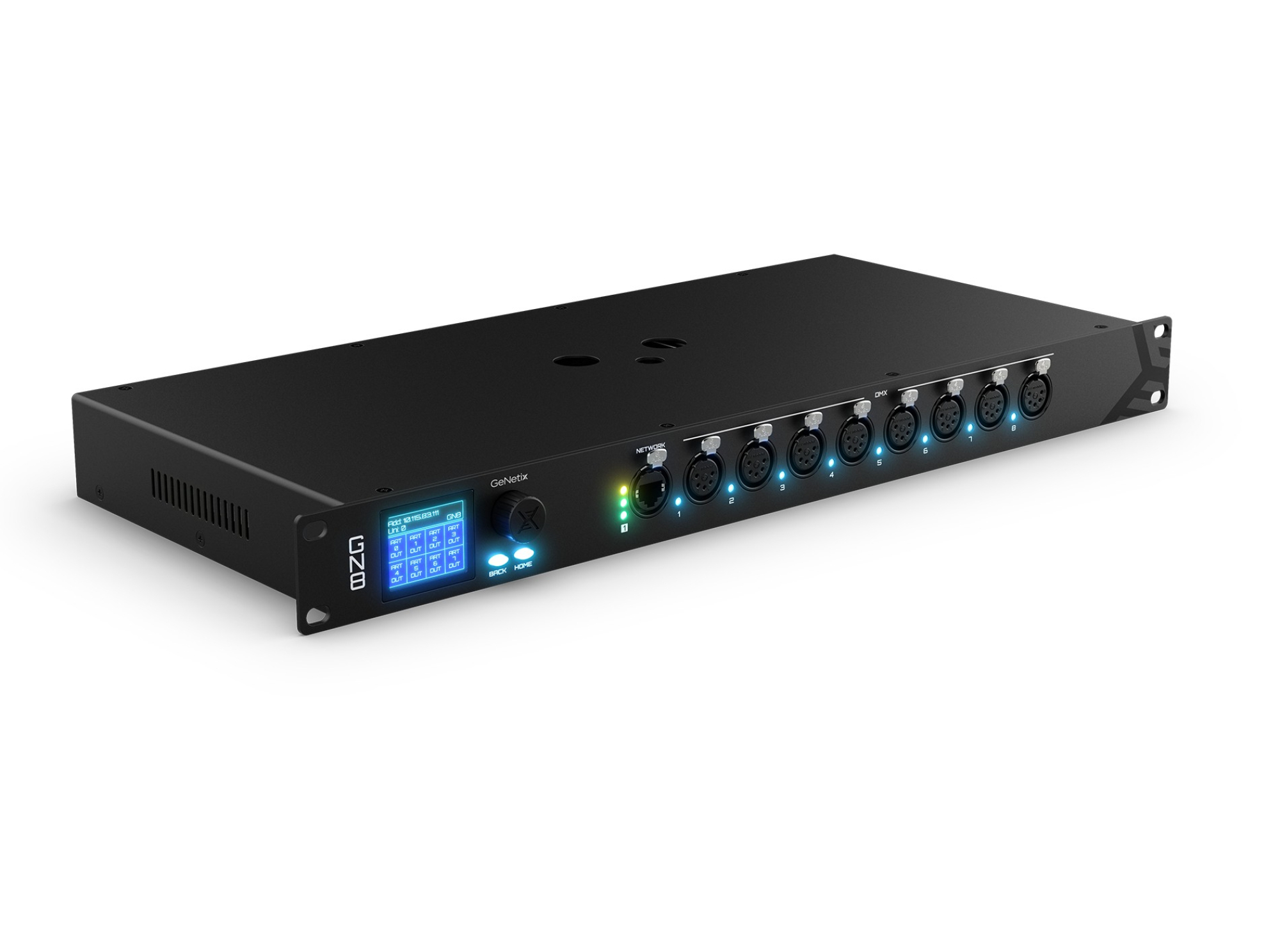 GeNetix GN8 är en enklare 8-portars node: GN8 fungerar som en Art-Net- eller sACN-nod till DMX (1st nätverks-port in + 8st DMX 5-pols utgångar). GN8 stödjer också DMX-synk + "lost signal" behandling. GeNetix GN8-noden kan monteras i tross (M12), eller i 19 tum rack: