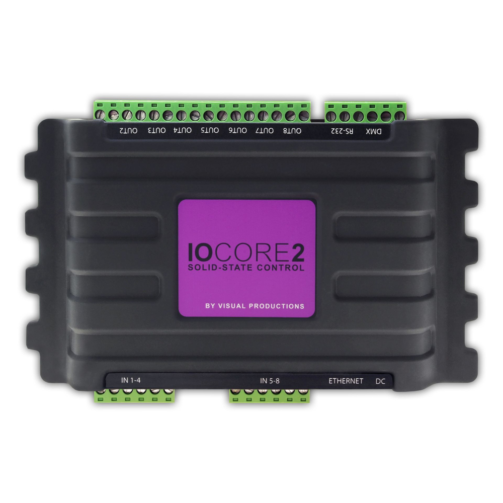 Visual Productions IOCore2 är ett nätverksbaserat solid-state-gränssnitt för GPIO-signaler. Den har åtta GPI-portar som kan konfigureras som digitala kontaktförslutningar eller analoga 0-10V nivåingångar. IoCore2 har också åtta GPO-portar som är försedda med potentialfria relä-switchar. Dessutom har den en RS-232-port, en dubbelriktad DMX-512-port och den stöder många Ethernet-baserade protokoll.