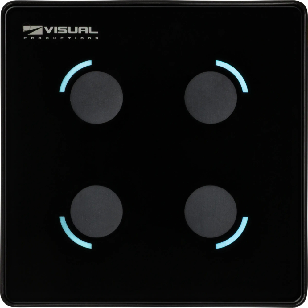 Visual productions Netpanel B4 är en styrpanel med glasfinish och kapacitiv touchkontroll, programmerbara RGB-LEDs, samt haptisk feedback.