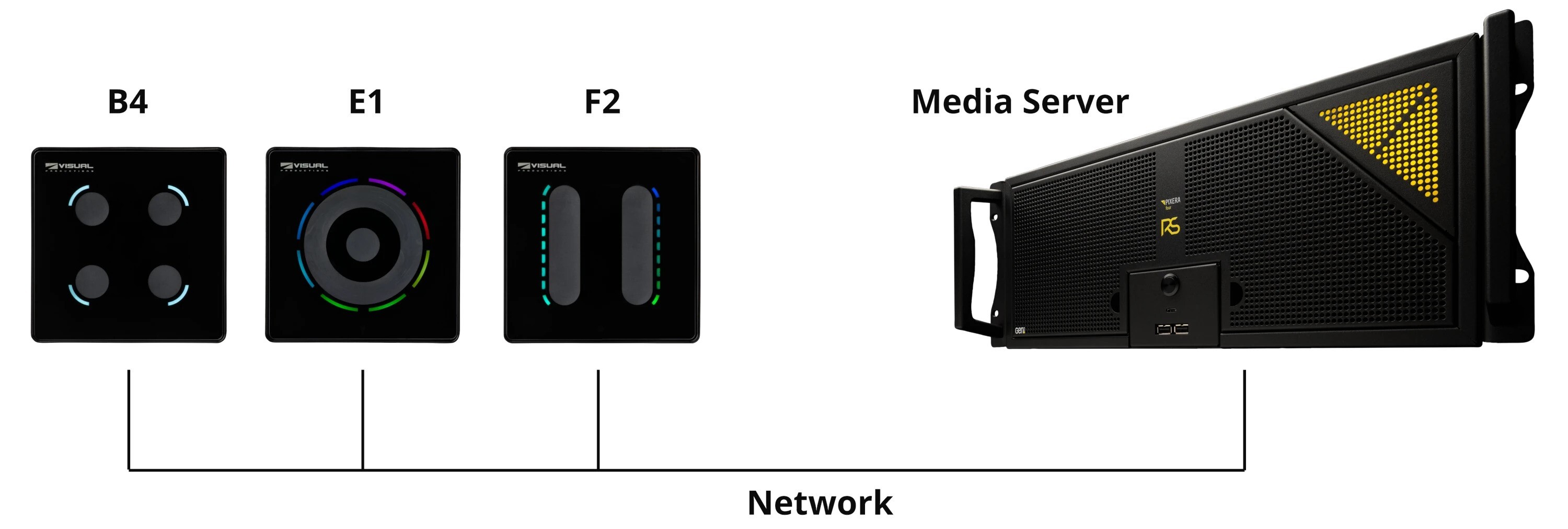 Netpanel E1 kan också styra tredjeparts-enheter via UDP, OSC eller TCP/IP-kommandon: På så sätt kan Visual Productions NetPanel-modeller agera komplett styrpanel, i mindre och enklare AV- och belysnings-sammanhang.