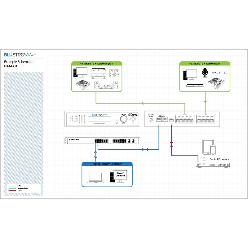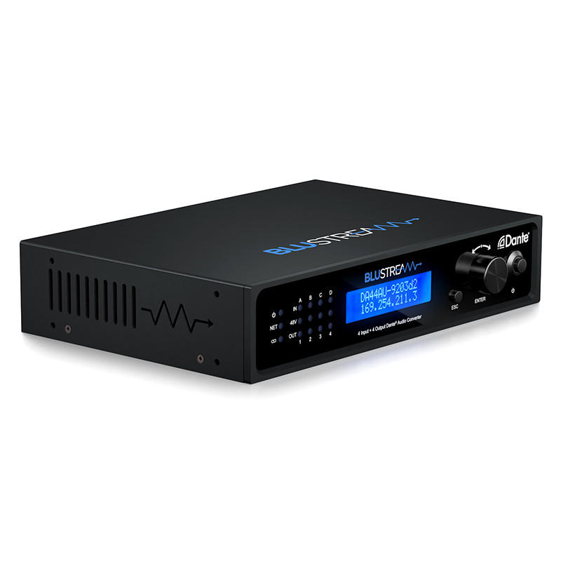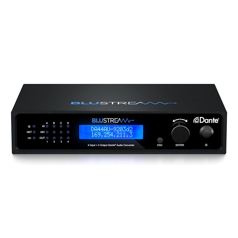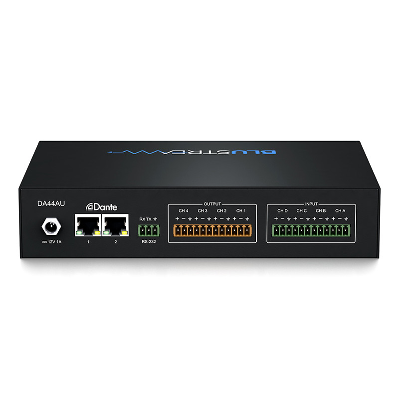 Blustream DA44AU har designats för att överföra 4st analoga ljudsignaler till nätverksbaserat Dante-ljud och tvärtom. Det vill säga fyra kanaler ljud i båda riktingar.