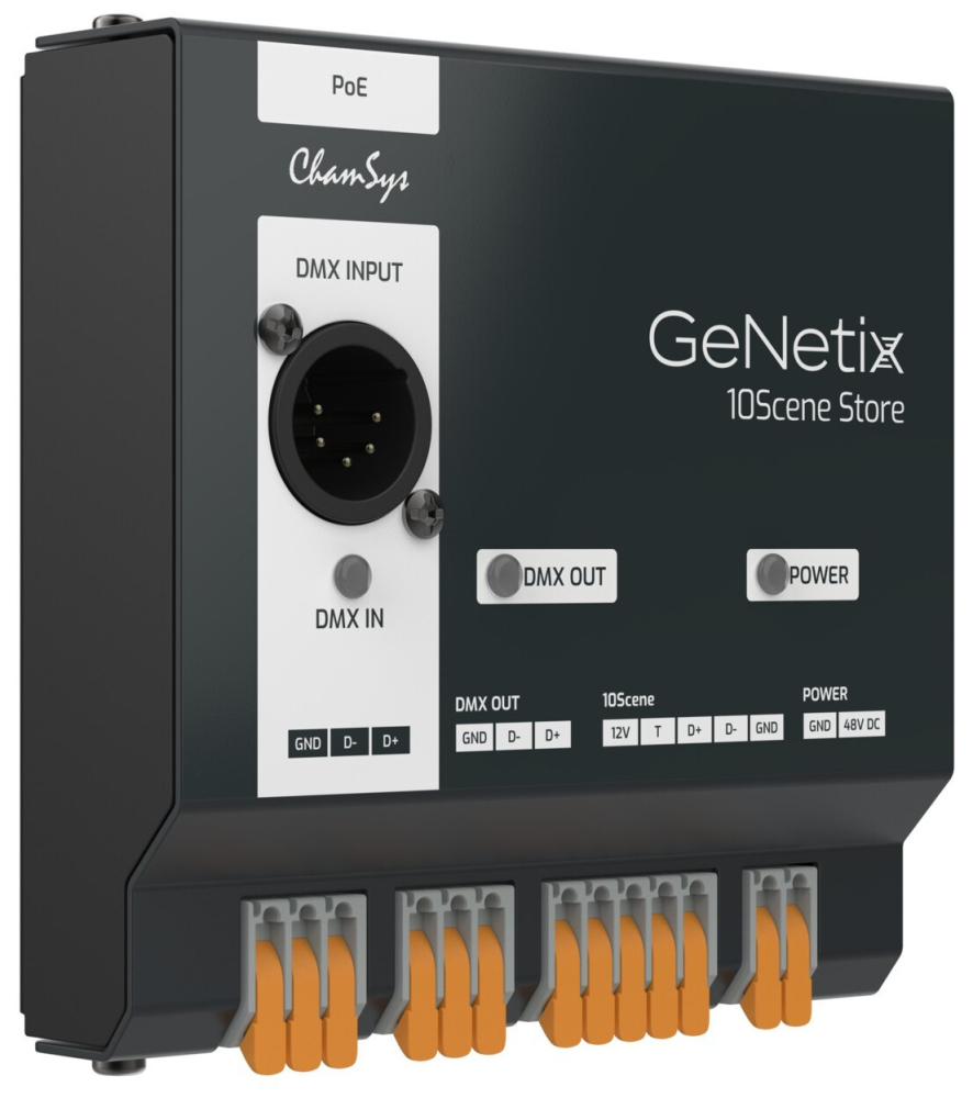 GeNetix 10Scene Store är specifikt, en fristående uppspelningsenhet / DMX-recorder som kan spara upp till 10st statiska scener: Scenerna kan skickas via nätverk från Chamsys QuickQ / MagicQ-bord, eller spelas in från valfri källa / ljusbord via DMX-ingångarna (XLR hane eller Wago).
