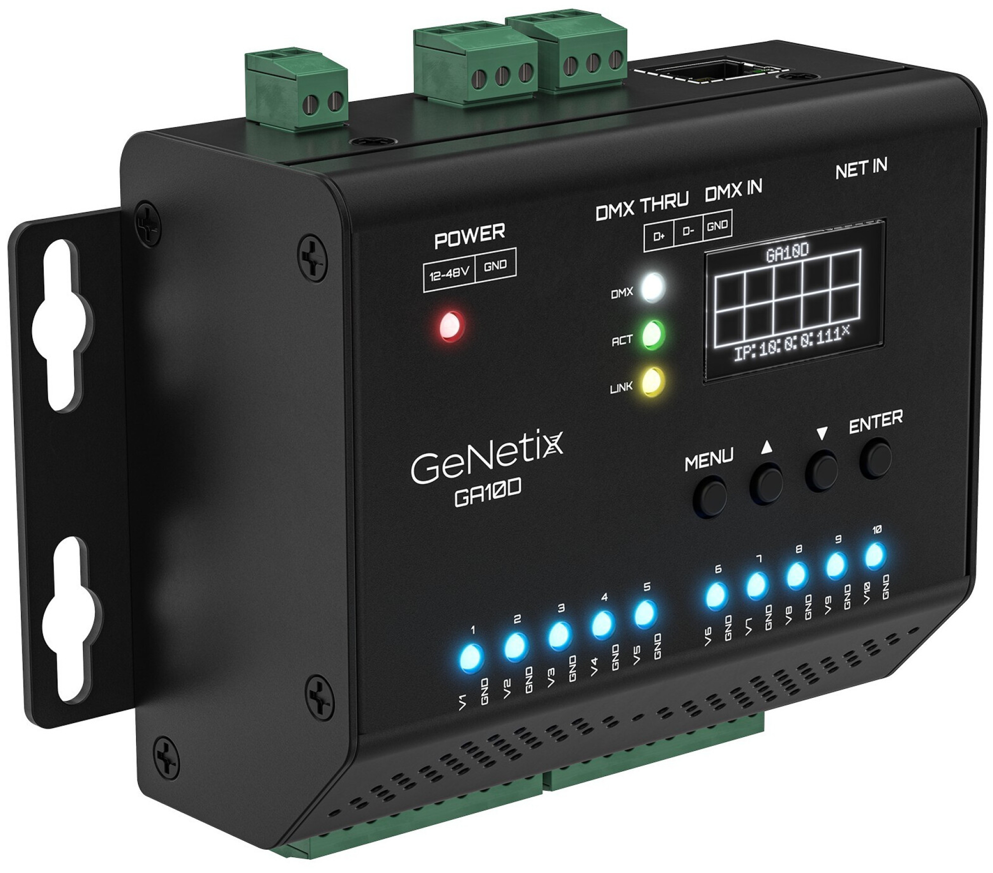 GeNetix GA10D är en omvandlare mellan DMX och 0 - 10V för att kunna integrera äldre 0 - 10V enheter i ett DMX-, sACN eller Art-Net sammanhang. Totalt 10st individuella 0 - 10V utgångar. Genetix DA10D kan DIN-monteras (monteringsclip medföljer) och strömförsörjs med DC 12 - 48V (nätdel tillkommer).