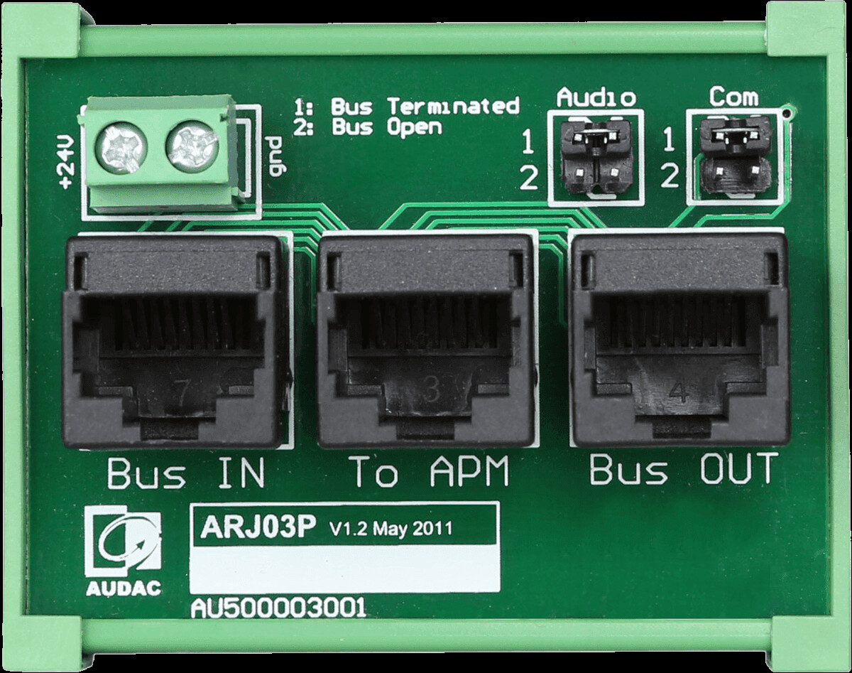 ARJ03P består av tre RJ45-kontakter, en "BUS IN"- och en "BUS OUT"-kontakt för inkommande och utgående anslutningar, medan den tredje kontakten kan anslutas till i databussen adderade in- eller utgångsmoduler.