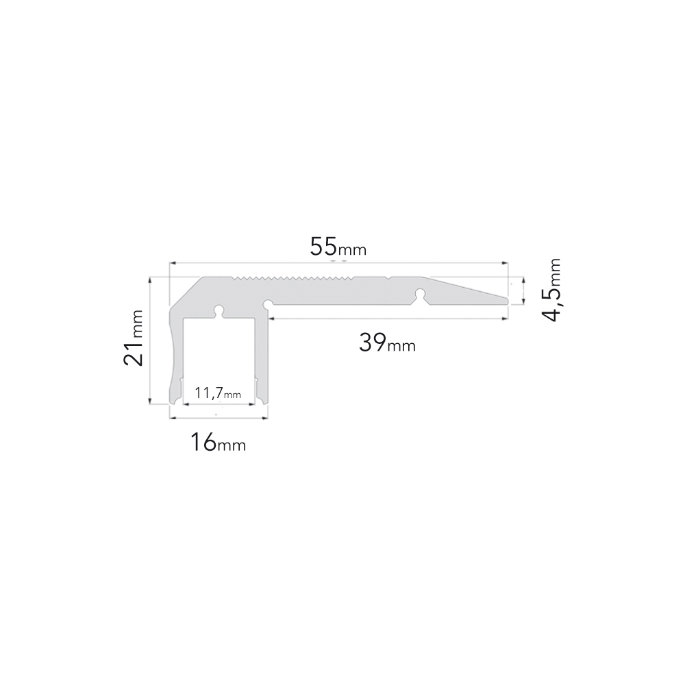 LeDux 2,0 m trappnosprofil. Aluminiumlegering med hög densitet, högt tryckmotstånd. "Walk-Over-Safe" räfflor för ökad säkerhet. Belysning nedåtriktad. Frostat täcklock medföljer.