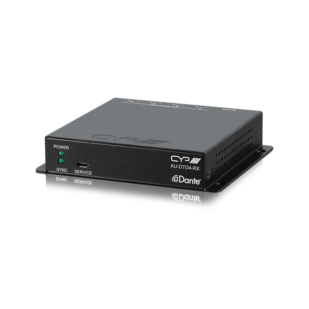 CYP AU-DTO4-RX är en Dante Decoder som tar emot nätverksbaserat, distribuerat Dante-ljud och fördelar ut fyra balanserade ljudutgångar. Anslutning från decodern vidare i signalkedjan, görs obalanserat eller balanserat via de medföljande Euroblock-plintarna. En riktig plug & play-enhet som drivs med PoE (Power over Ethernet) nätverk.