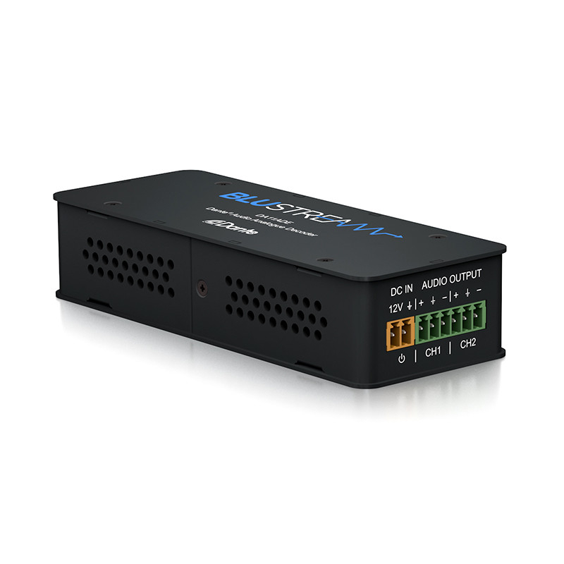 Blustream DA11ADE har designats för att avkoda två digitala Dante-signaler till 2 st analoga ljudkanaler, obalanserat eller balanserat via installationsvänliga Euroblock-plintar. En riktig plug & play-enhet som drivs med antingen PoE (Power over Ethernet) nätverket eller via lokal 12V strömförsörjning (tillval).