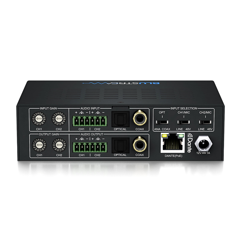 - Konverterar 2-kanaligt analogt ljud eller digitalt ljud till Dante digital signal