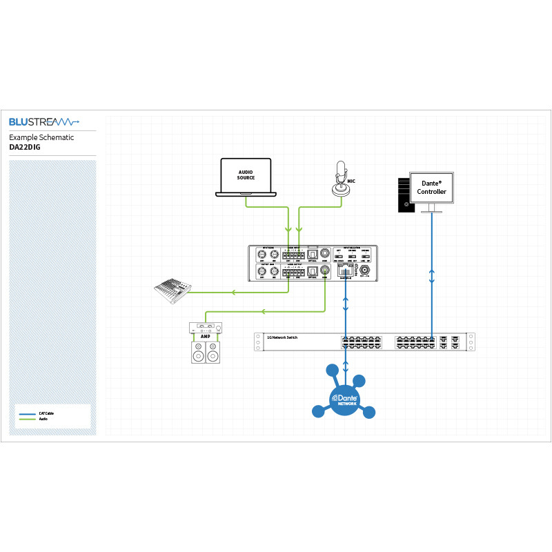 DA22DIG har designats för att överföra analoga eller digitala ljudsignaler till nätverksbaserat Dante-ljud och tvärtom. Det vill säga två kanaler ljud i båda riktingar.