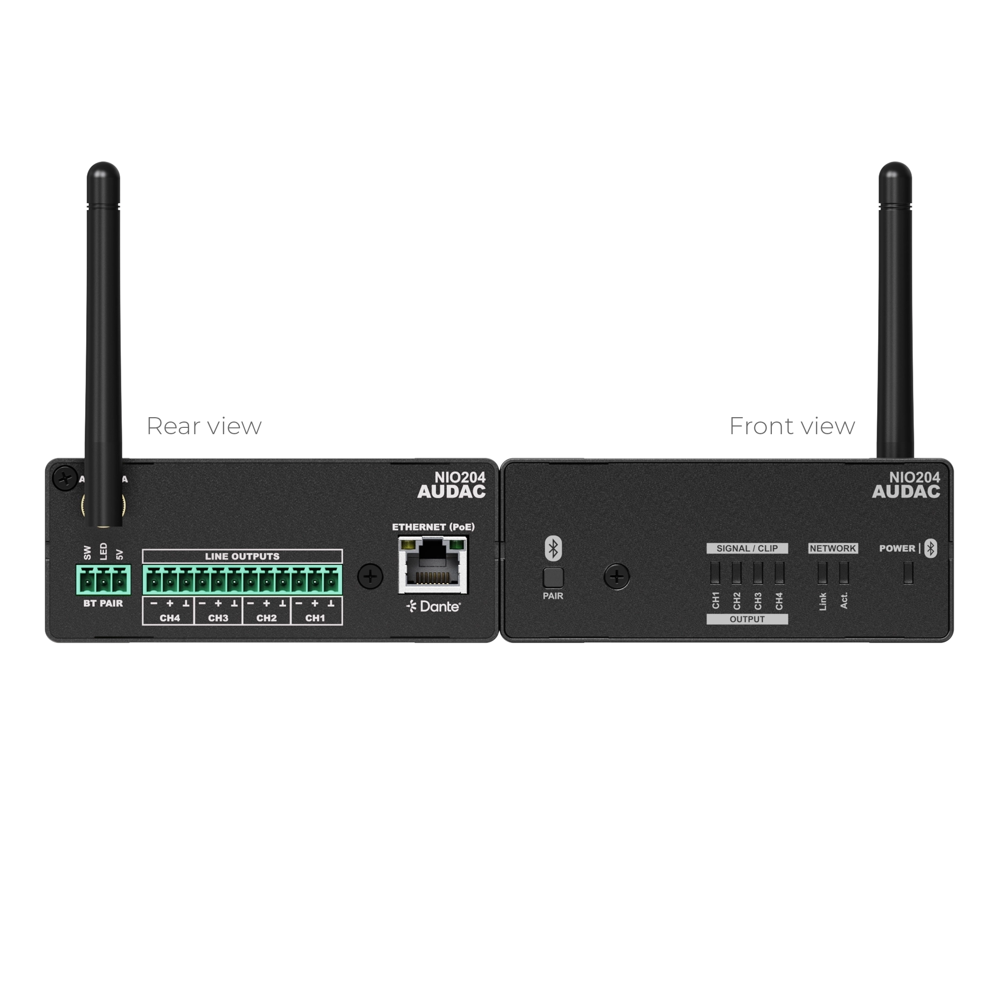 Audac NIO204 är en Dante / AES67 decoder med (4) fyra st balanserade analoga utgångar som är individuellt valbara mellan mik- eller line-nivå. Förutom dessa analoga anslutningar erbjuder NIO204 också 4st Dante kanaler in + ut, samt en Bluetooth-anslutning.