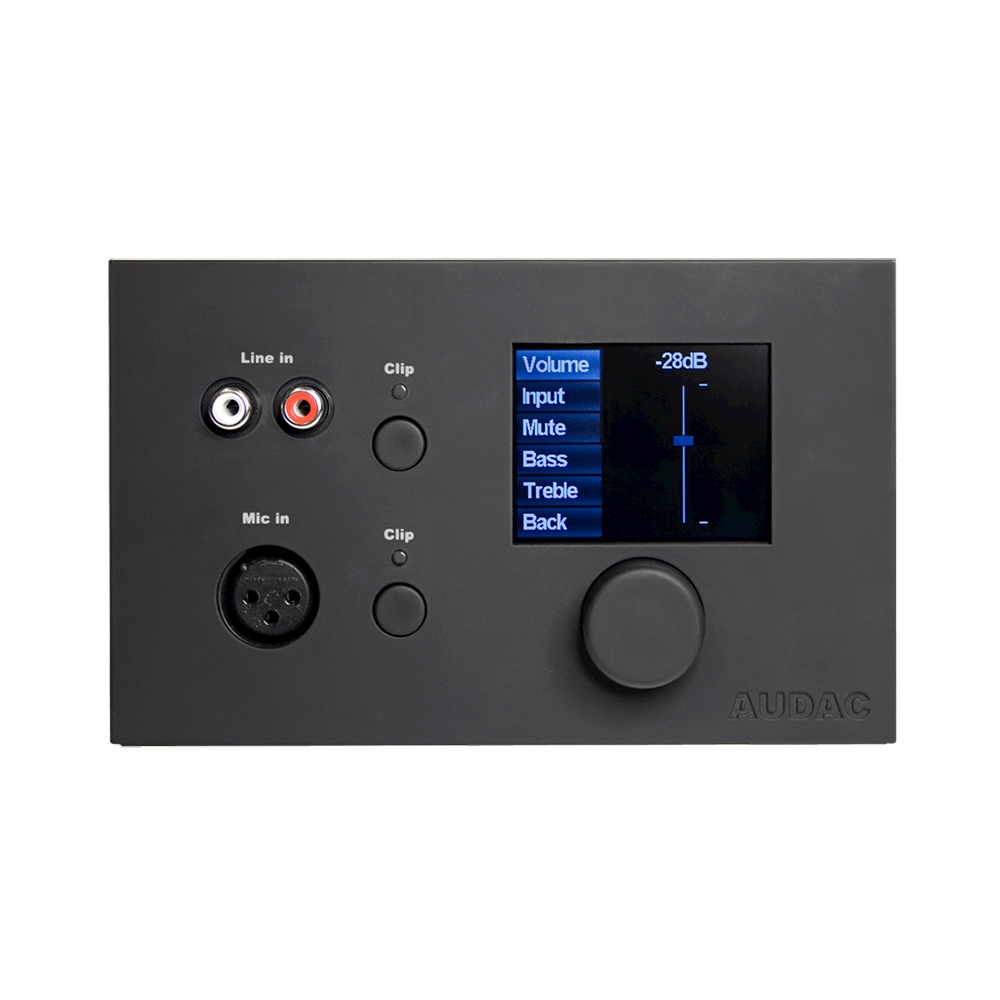 Volymkontroll samt val av ljudkälla sker via den roterande ratten med push-funktion, vilket ger ett enkelt och tydligt handhavande. Info visas i den integrerade 2,5" displayen. Den lokala balanserade XLR-ingången för mikrofon, har möjlighet till phantommatning (12V).