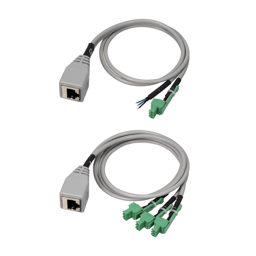 - Inkluderar två 46 cm (18″) breakout-kablar: RJ45 (hona) till tre 3-pin Euroblock-kontakter (hona); RJ45 (hona) till 3-pin Euroblock-kontakt (hona) och oterminerade LED-ledare