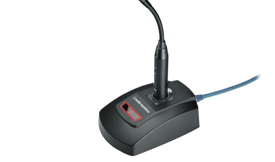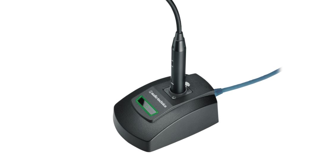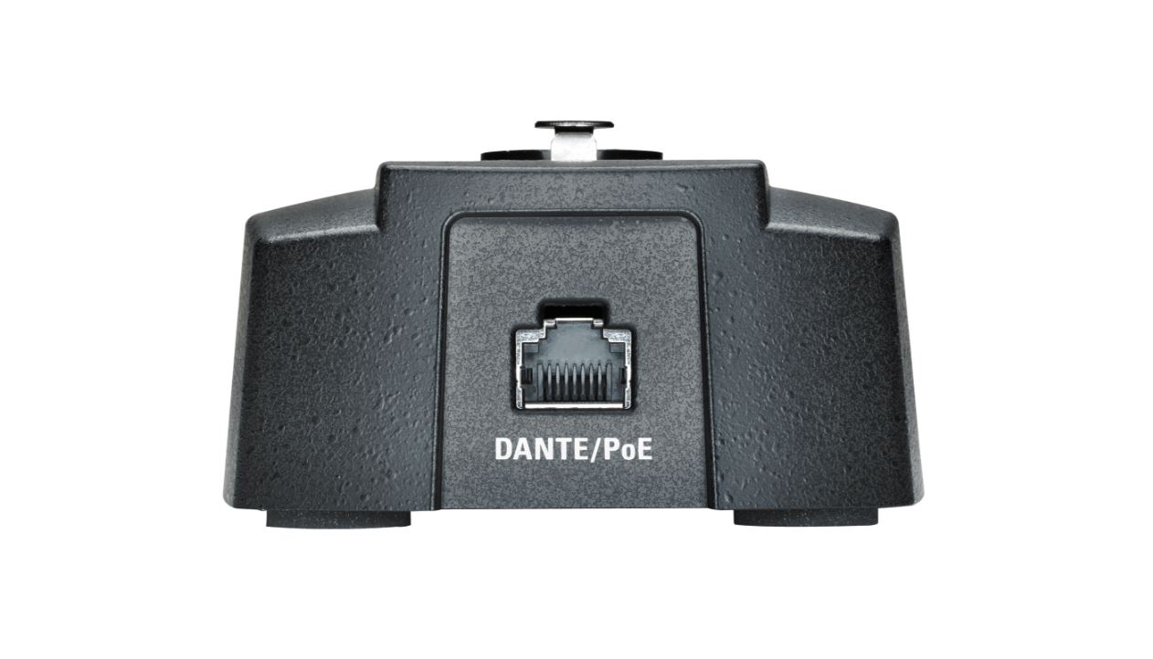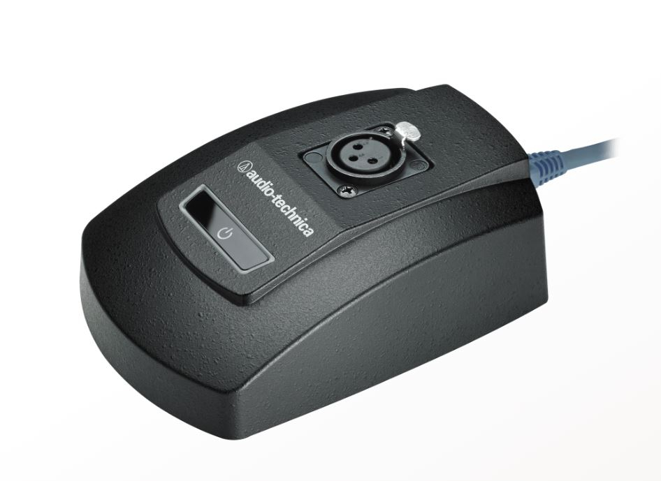 ATND8677A är en Dante-baserad bordsfot för XLR svanhalsmikrofoner som drivs med PoE från nätverket. Tryckknappen kan ställas in för att växla mellan "toggle på/av", "push to talk" eller "push to mute".