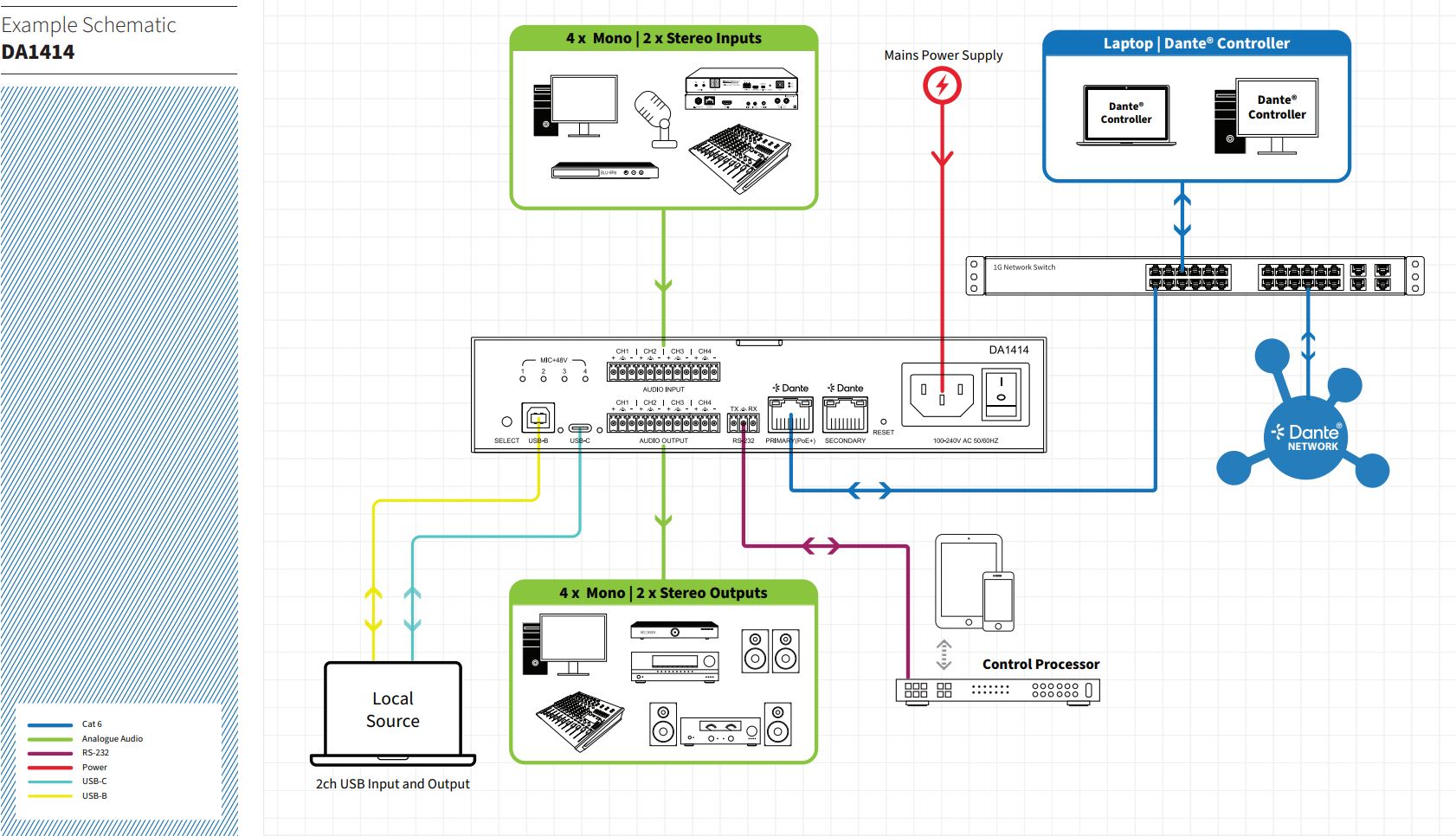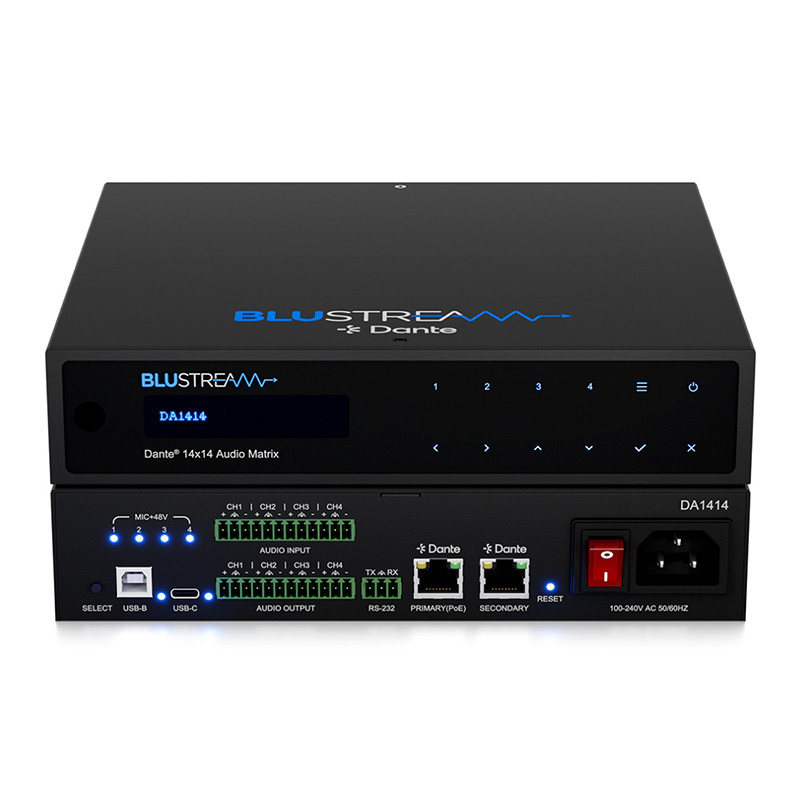 - 14 x 14 ljudmatris med Dante/AES67, balanserad/obalanserad analog och USB-ljudanslutning