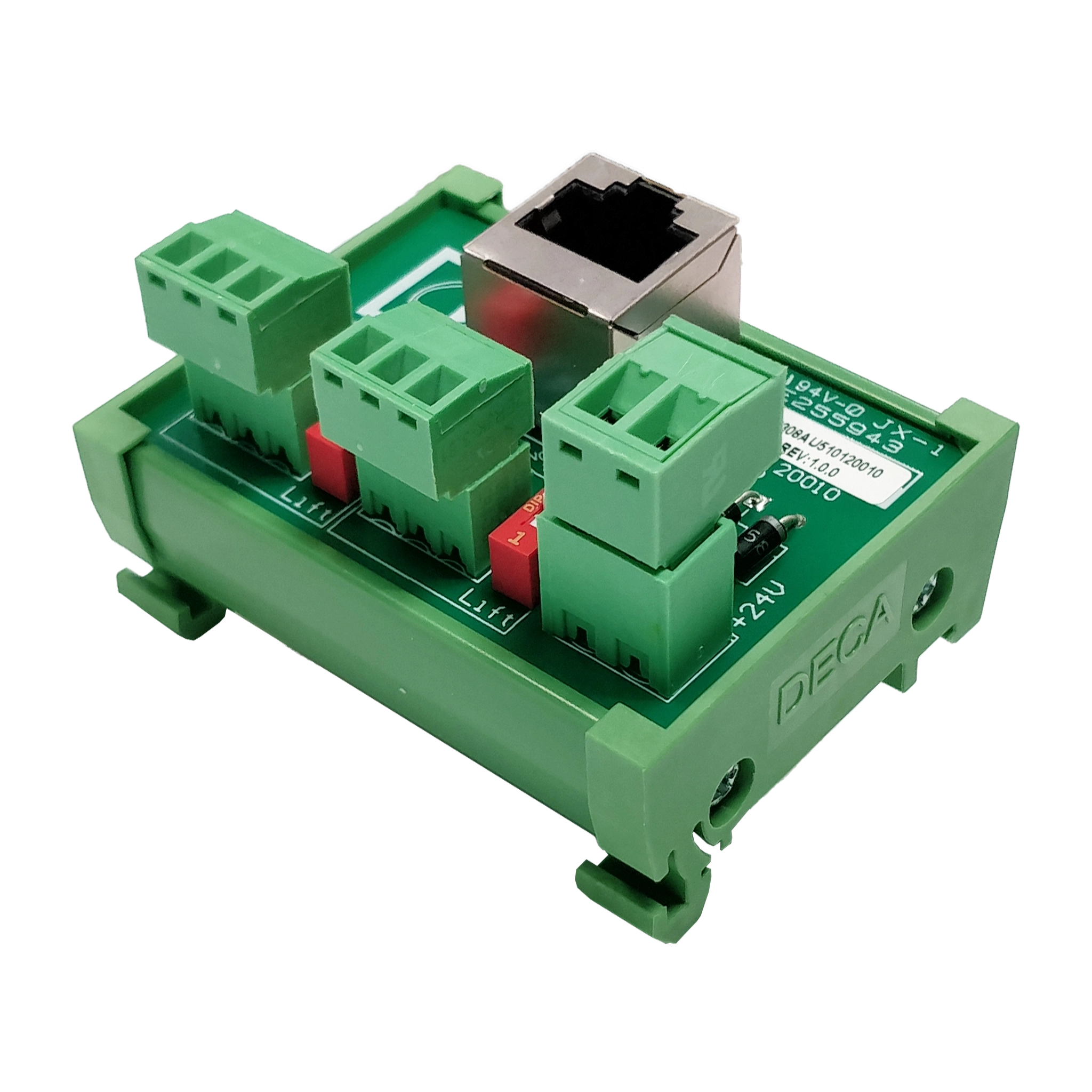 - Spänningsmatning +24V DC (till Pin 3 i RJ45-kontakten): 1 x 2-pin Euroblock (5.08mm)