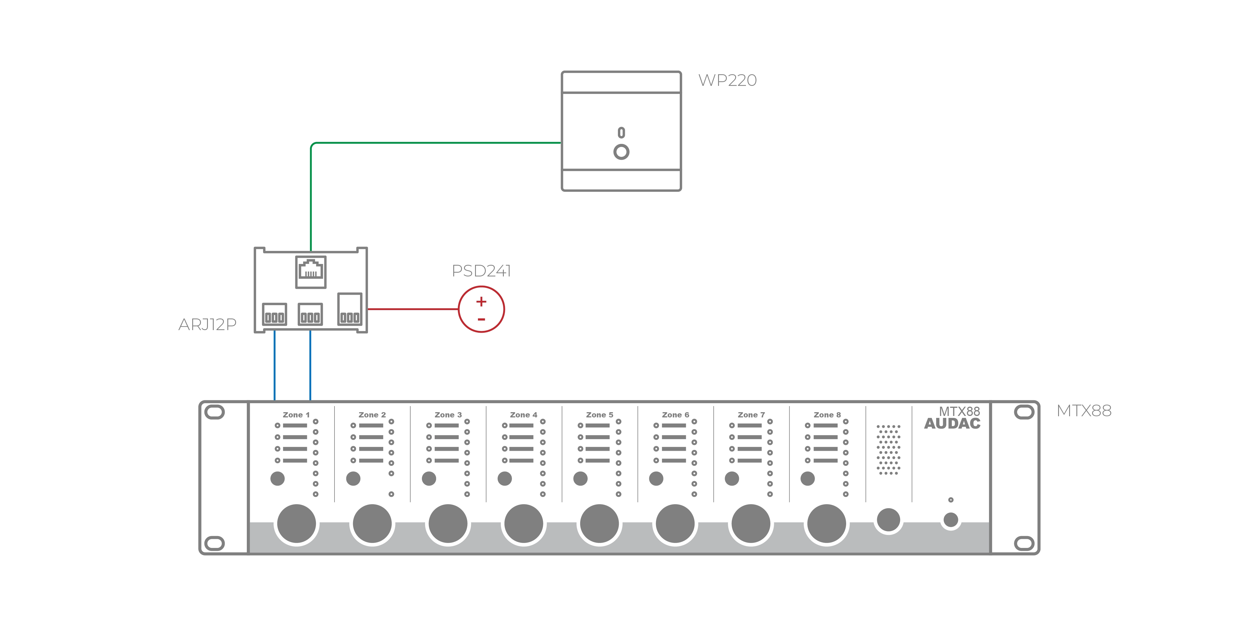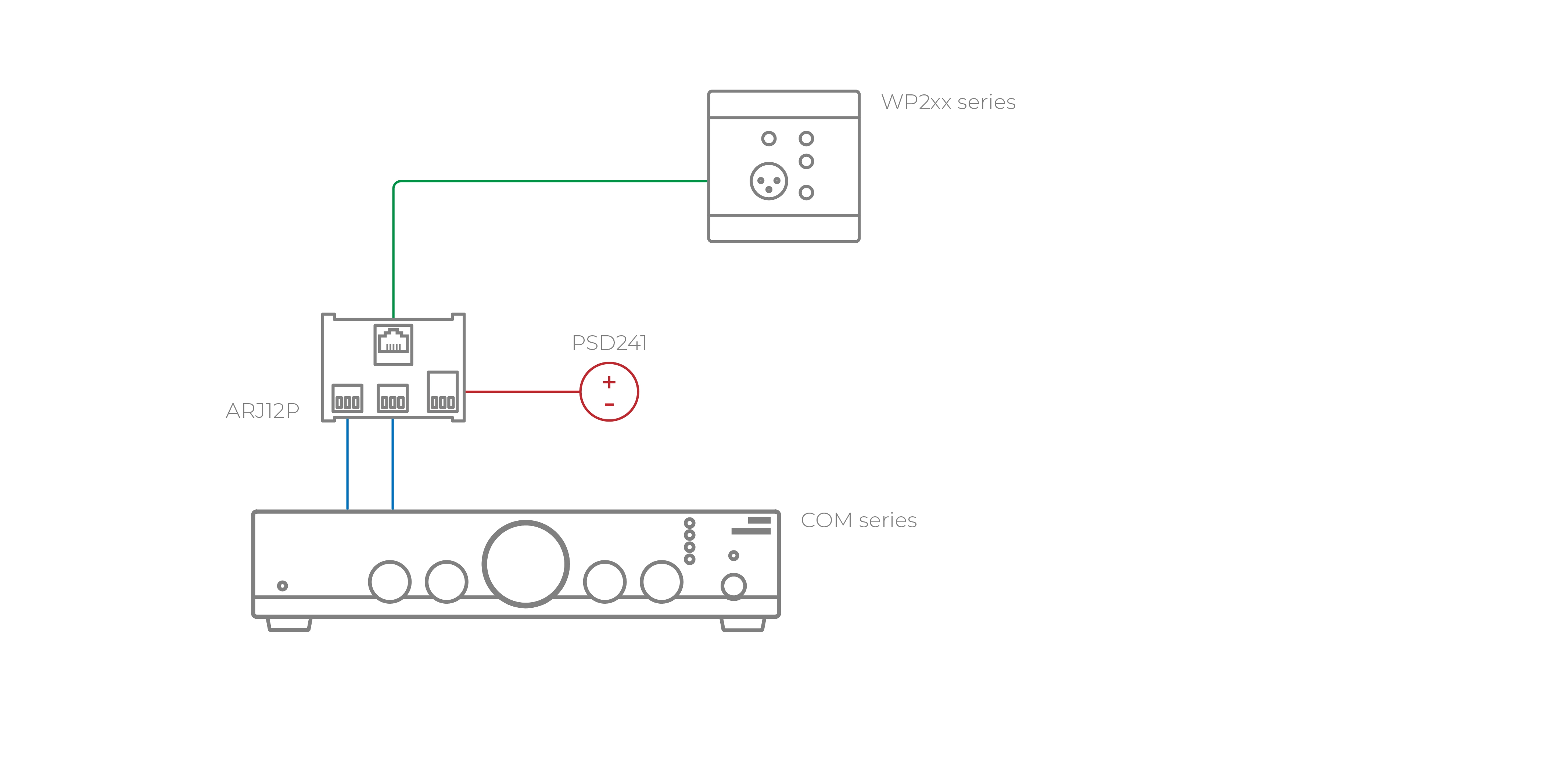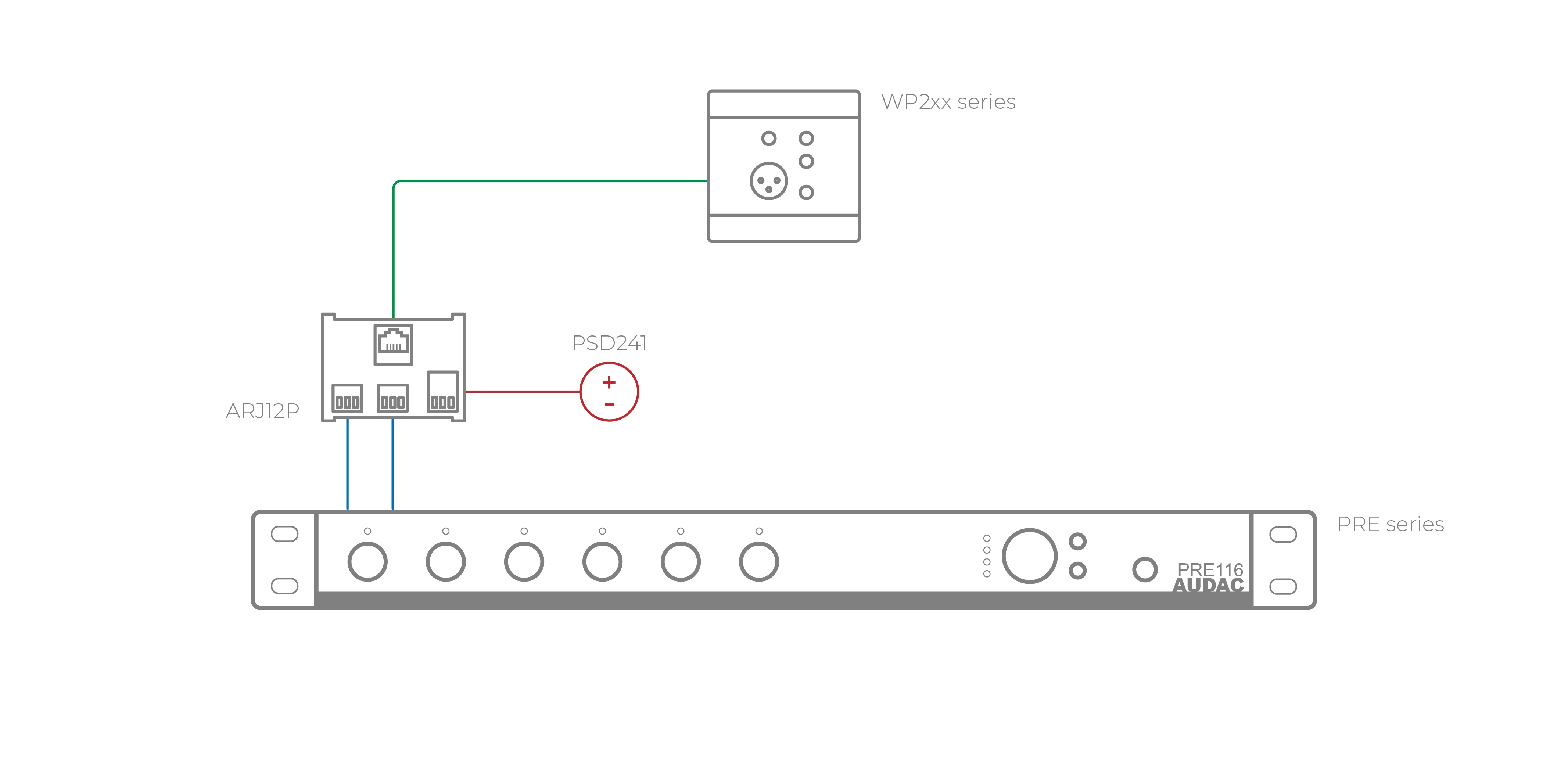 Om strömförsörjning för distribuerad signal krävs, så har ARJ12P en 2-plints anslutning för detta, och anslutningen +24V DC matar Pin 3 i RJ45-kontakten. Ett exempel är t.ex. som förlängning för Audacs WP-paneler.