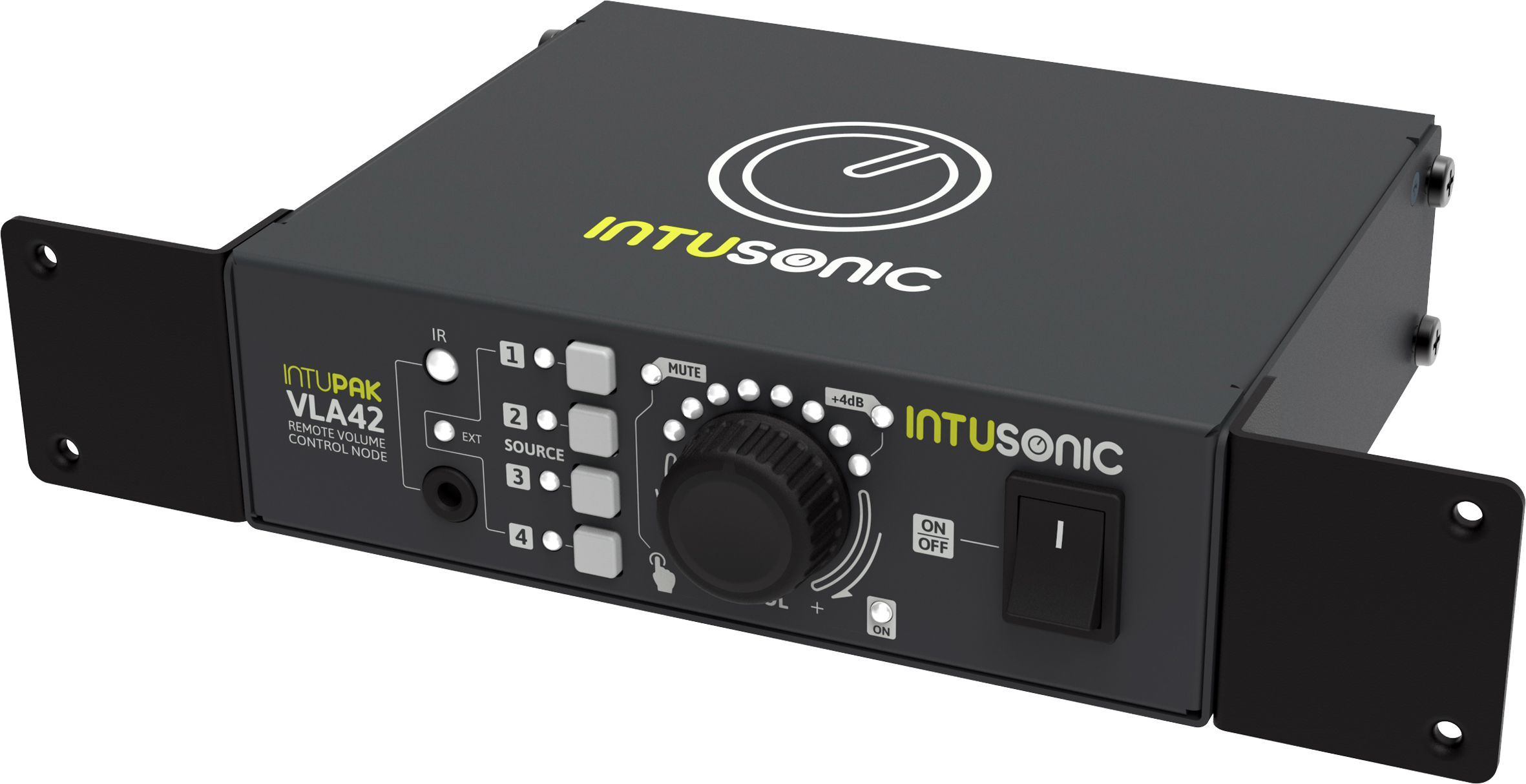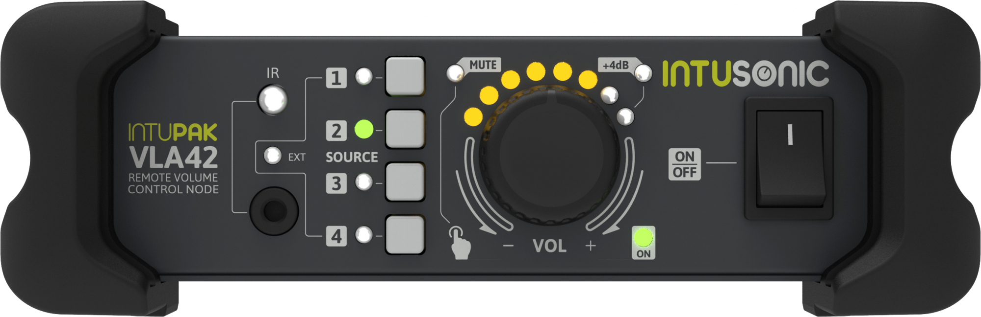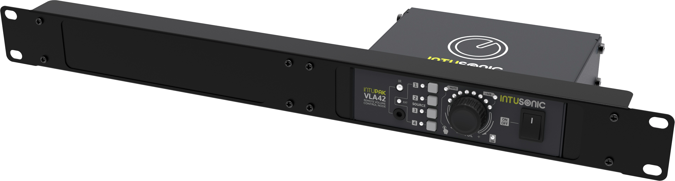 Intusonic IntuPak VLA42 är en kompakt miniljudswitch / node med fyra line-ingångar som kan switchas mot utgången. Lättöverskådlig och användarvänlig layout med källval och stort volymreglage på fronten. En IR-fjärrkontroll (IRB44) medföljer och ger användaren trådlös kontroll över bla. källval, mute-funktion och mastervolym.