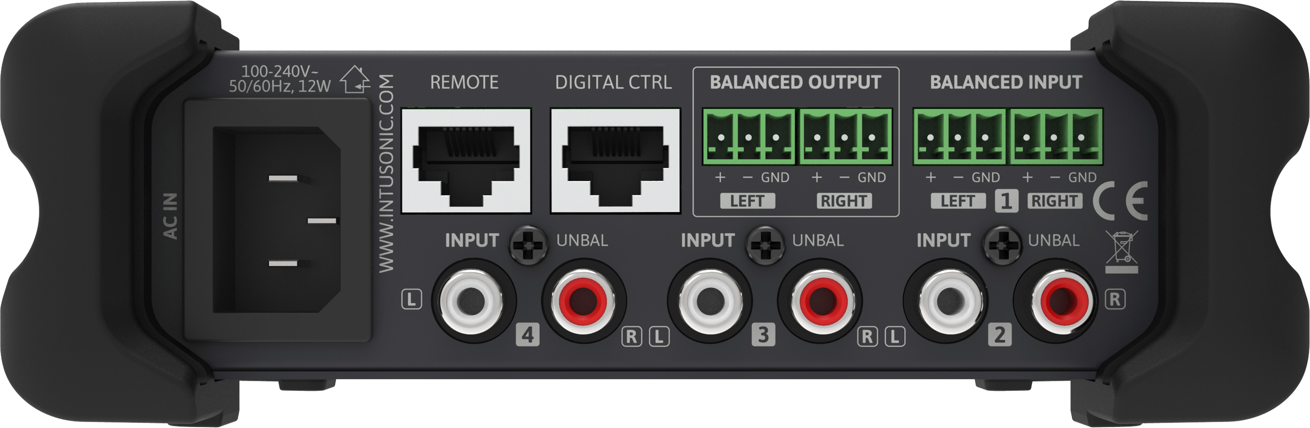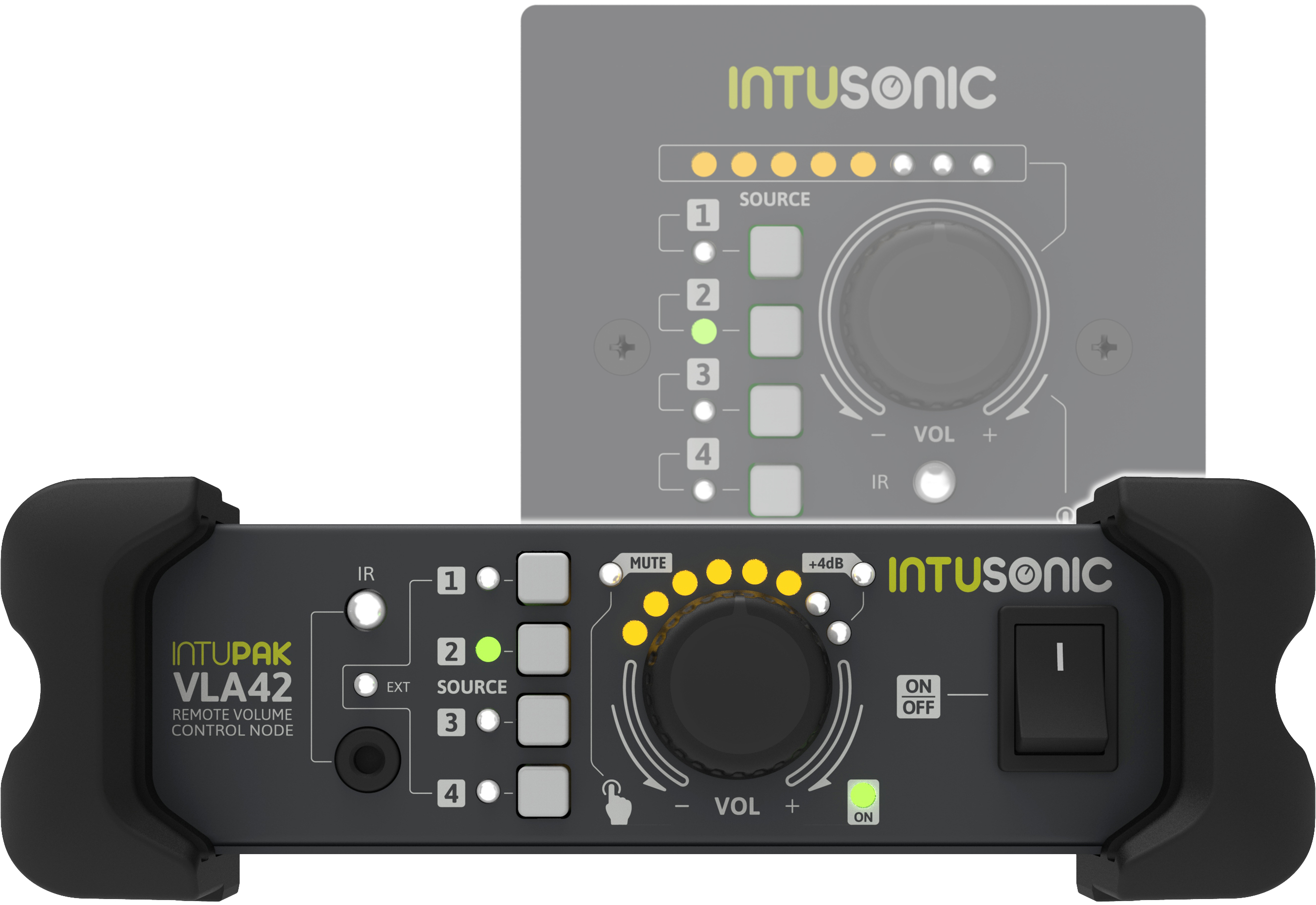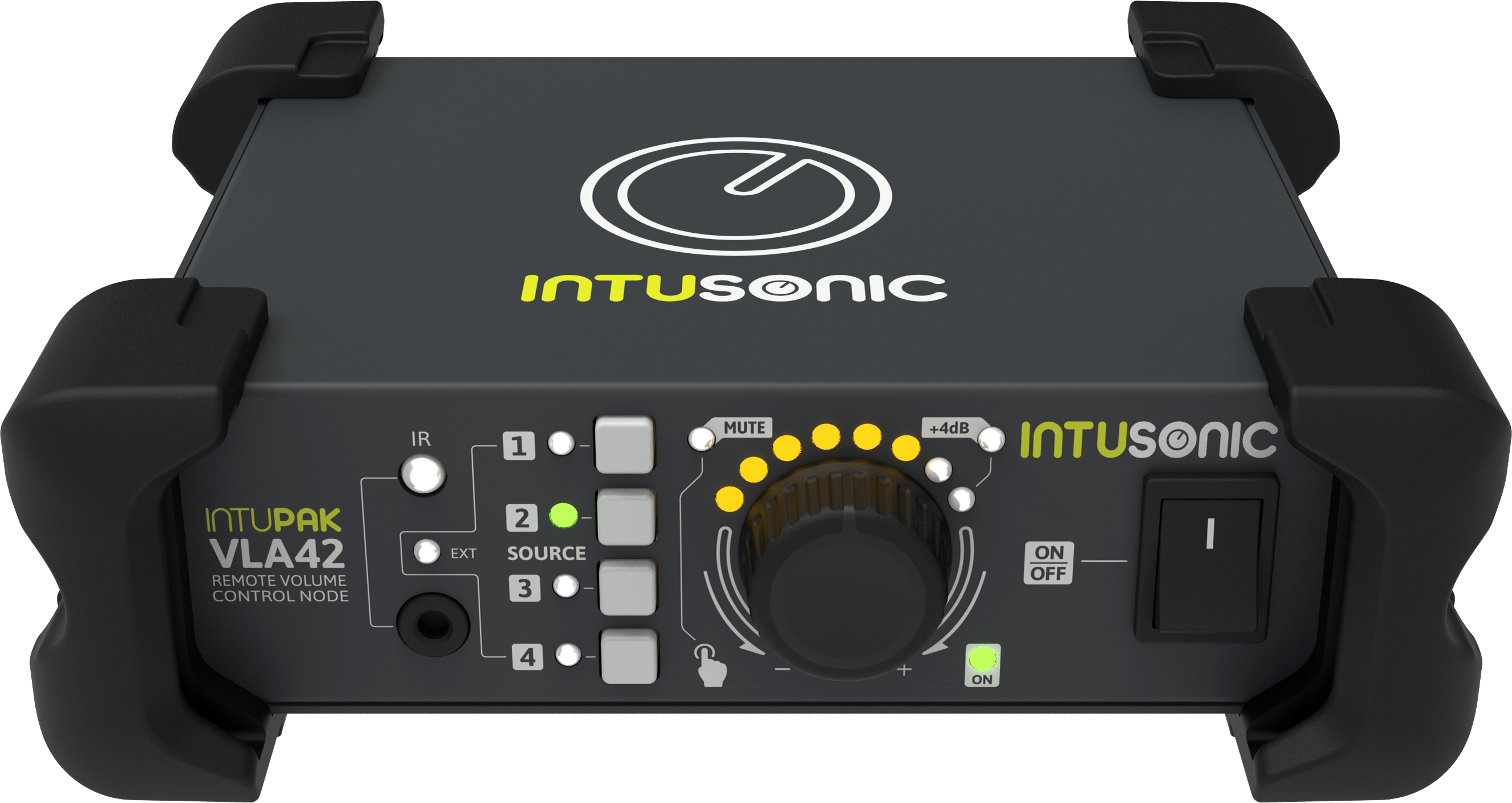 Intusonic IntuPak VLA42 är en kompakt miniljudswitch / node med fyra line-ingångar som kan switchas mot utgången. Lättöverskådlig och användarvänlig layout med källval och stort volymreglage på fronten. En IR-fjärrkontroll (IRB44) medföljer och ger användaren trådlös kontroll över bla. källval, mute-funktion och mastervolym.