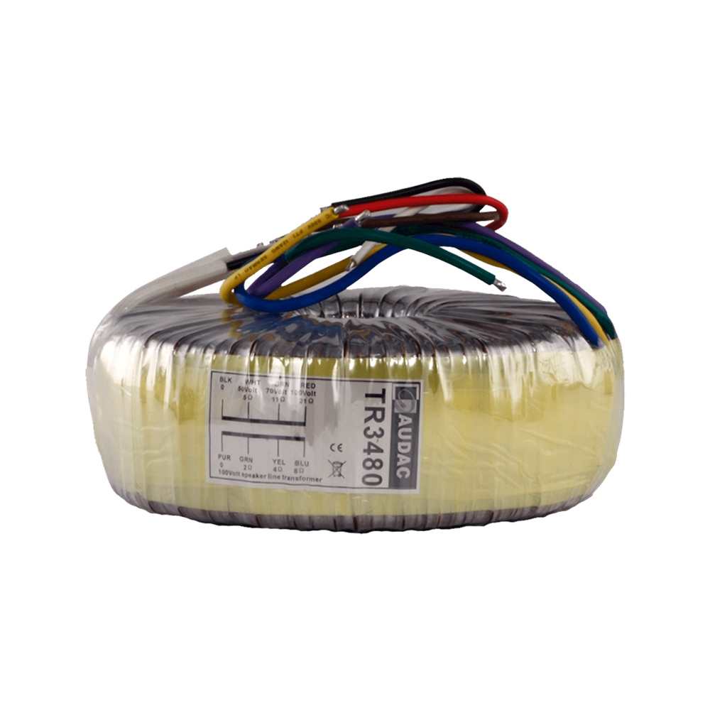 Audac TR3480 är en 480W linjetransformator. 50V, 70V och 100V anslutning, och på lågimpedansidan kan väljas mellan 2 Ohm, 4 Ohm och 8 Ohm.