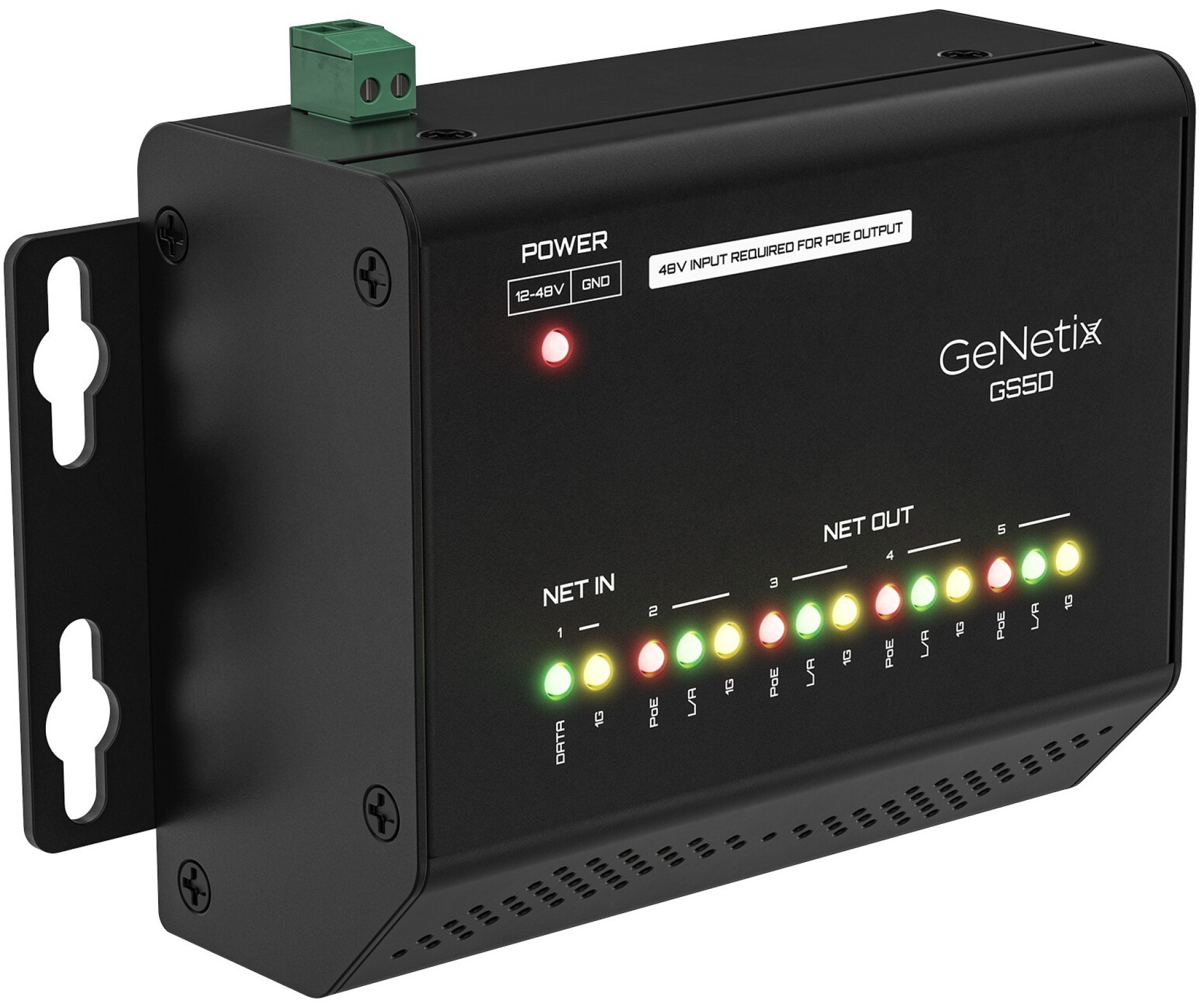 GeNetix GS5D är en 5-portars omanagerad Gigabit switch, som kan strömförsörjas via PoE. I kombination med en extern 48V strömförsörjning kan switchen också lämna PoE, på de första fyra fortarna. Portarna 1-4 kan lämna upp till 30W per port (PoE+), men med en totalbegränsning / PoE-budget på totalt 60W.