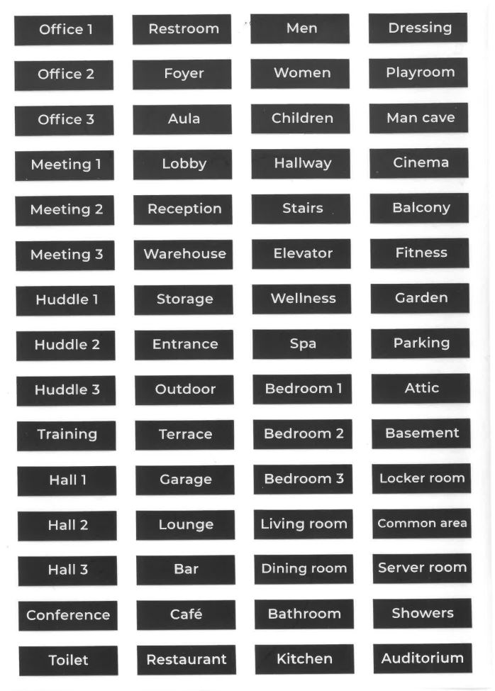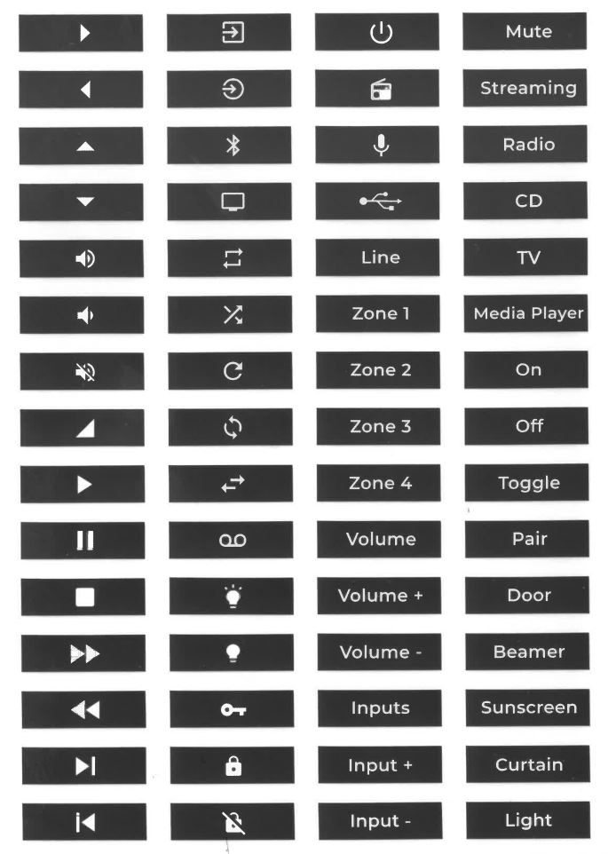 De fyra adresserbara knapparna kan benämnas i varsitt etikett-fönster: Det medföljer ett stort antal färdiga mallar med både benämning på engelska samt relevanta symboler (se ovan): Det går också att göra egna (t.ex. svensk text) med t.ex. en Dymomaskin med 6mm tejp för att synas bra.
