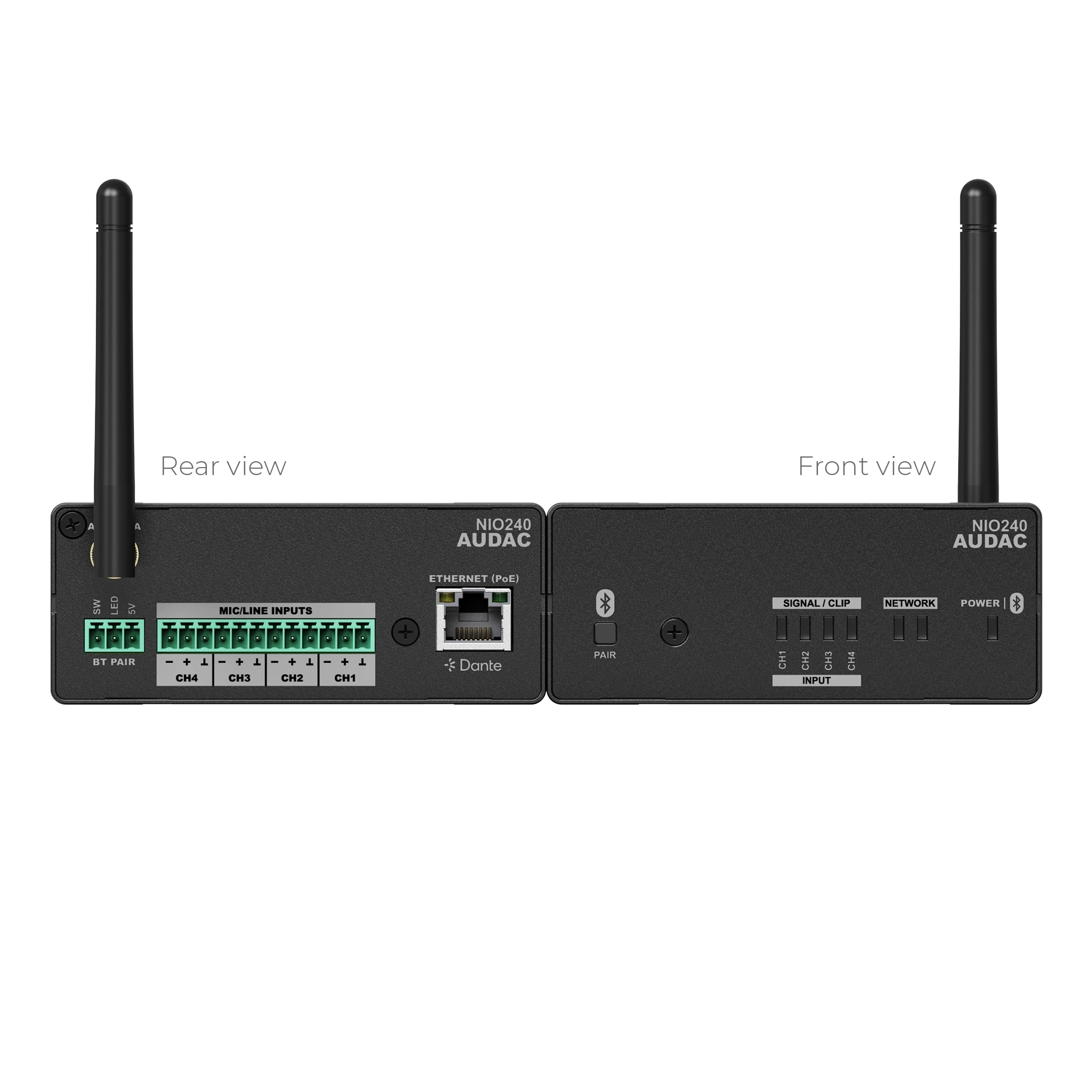 Audac NIO240 är en Dante / AES67 encoder med (4) fyra st balanserade analoga ingångar som är individuellt valbara mellan mik- eller line-nivå. Förutom dessa analoga anslutningar erbjuder NIO240 också 4st Dante kanaler in + 4st Dante kanaler ut, samt en Bluetooth-anslutning.