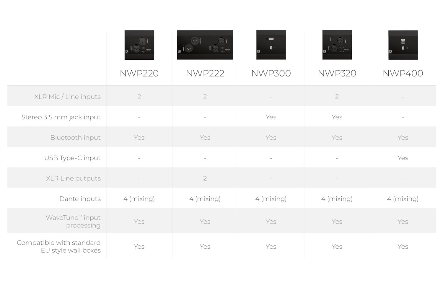Audac NWP220/W är en Dante / AES67 väggpanel med 2st XLR honor, samt en integrerad Bluetooth-mottagare. Utöver dessa analoga ingångar har panelen 4st Dante-kanaler in + ut, med DSP / processing- samt individuell nivå- och mixnings-möjlighet: