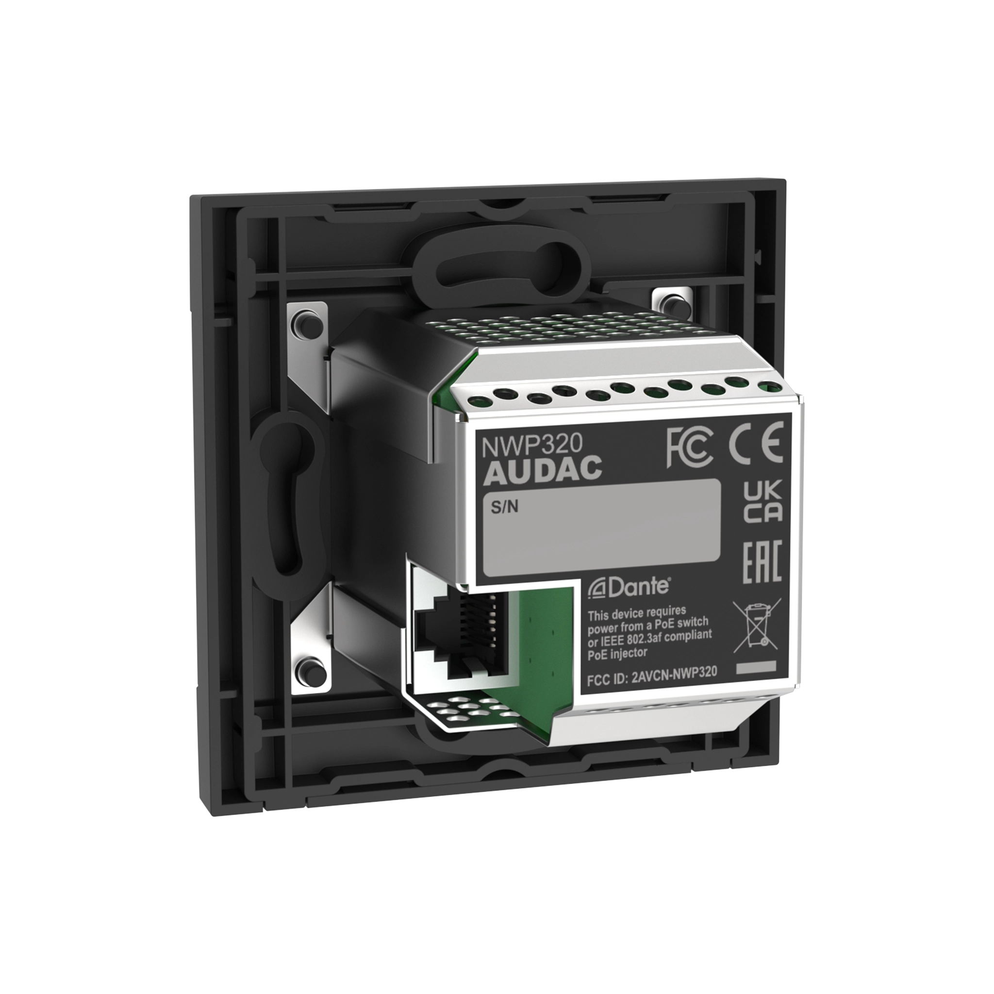 Audac NWP320/W är en Dante / AES67 väggpanel med 2st XLR honor, 3.5mm minitele hona, samt en integrerad Bluetooth-mottagare. Utöver dessa analoga ingångar har panelen 4st Dante-kanaler in + ut, med DSP / processing- samt individuell nivå- och mixnings-möjlighet:
