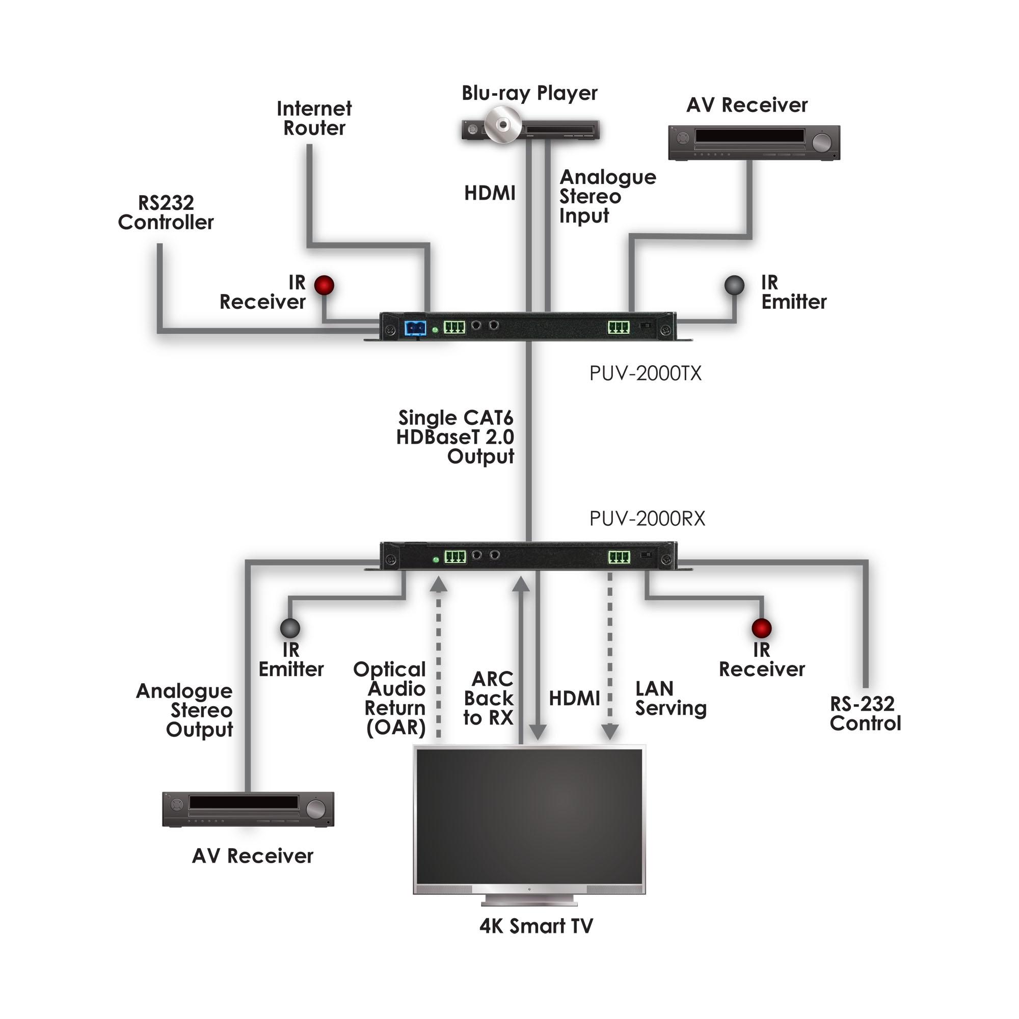 Förutom videoöverföringen har enheten även OAR (Optical Audio Return) och ARC (Audio Return Channel) som gör att ljud från en kompatibel bildskärm kan skickas tillbaka från mottagarenheten till sändaren(!). Allt ljud, bild, kontroll och ström överförs samtidigt via en enda CAT6a/7-kabel upp till 100 m.