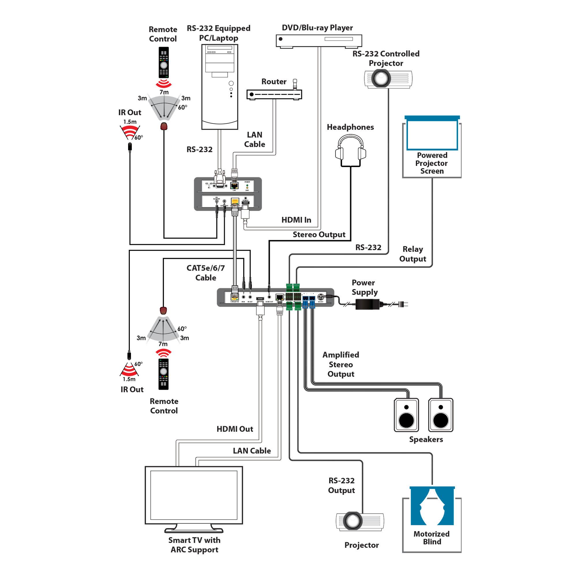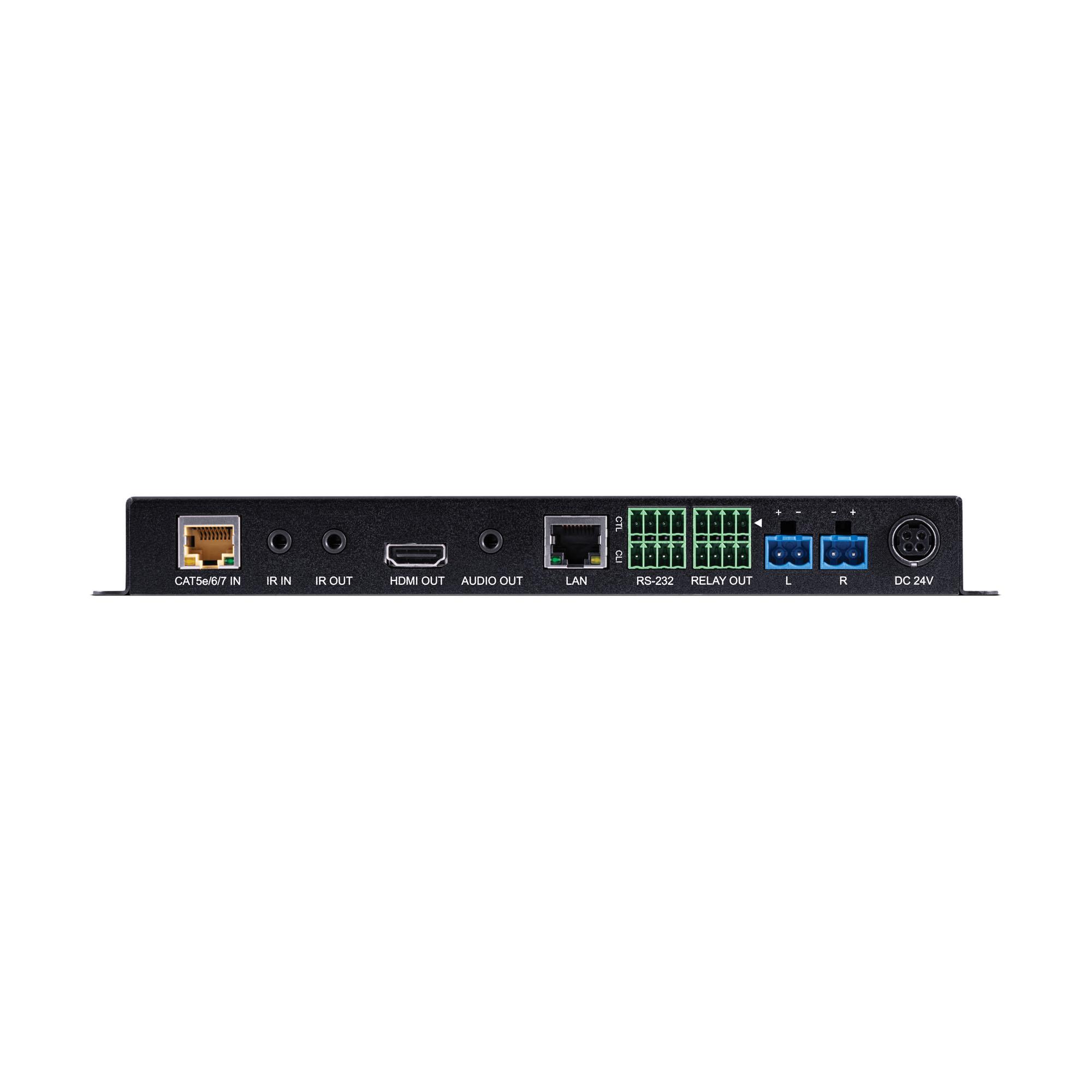 HDBaseT-ingången tar emot 4K UHD upp till 100 meter över en CAT kabel med Ethernet, RS-232 och IR.