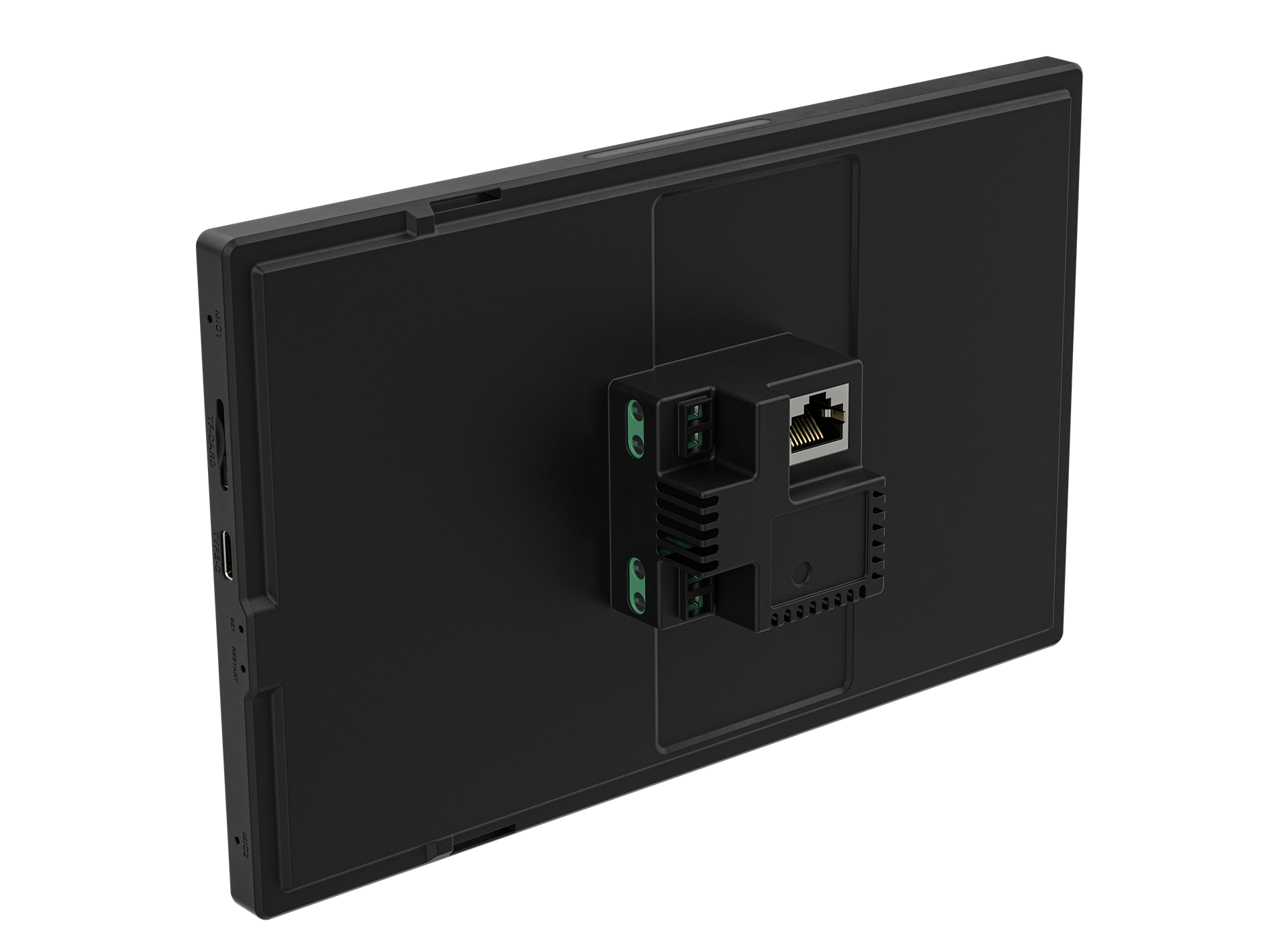 Panelen ansluts via LAN / nätverk med en PoE-switch och flera touchpaneler kan anslutas till samma nätverk som bordet / styrenheten / noden: Bra lösning om styrpaneler behöver monteras med långa avstånd ifrån varann, eller behövs vid olika passage & dörrar i en större lokal.