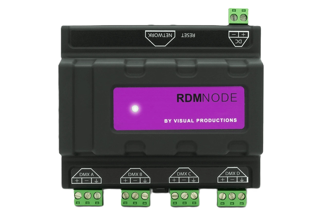 Visual productions RdmNode är en 4-ports eDMX-nod som konverterar Art-Net och sACN till DMX-512 och vice versa.