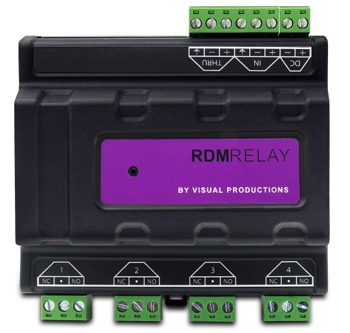 Litet och kompakt 230V relä, som är styrbart via RDM & DMX: Totalt fyra utgångar med max 16A per utgång: Val av både NC (normally closed) eller NO (normally open). DMX in samt thru via plintanslutning (Euroblock).
