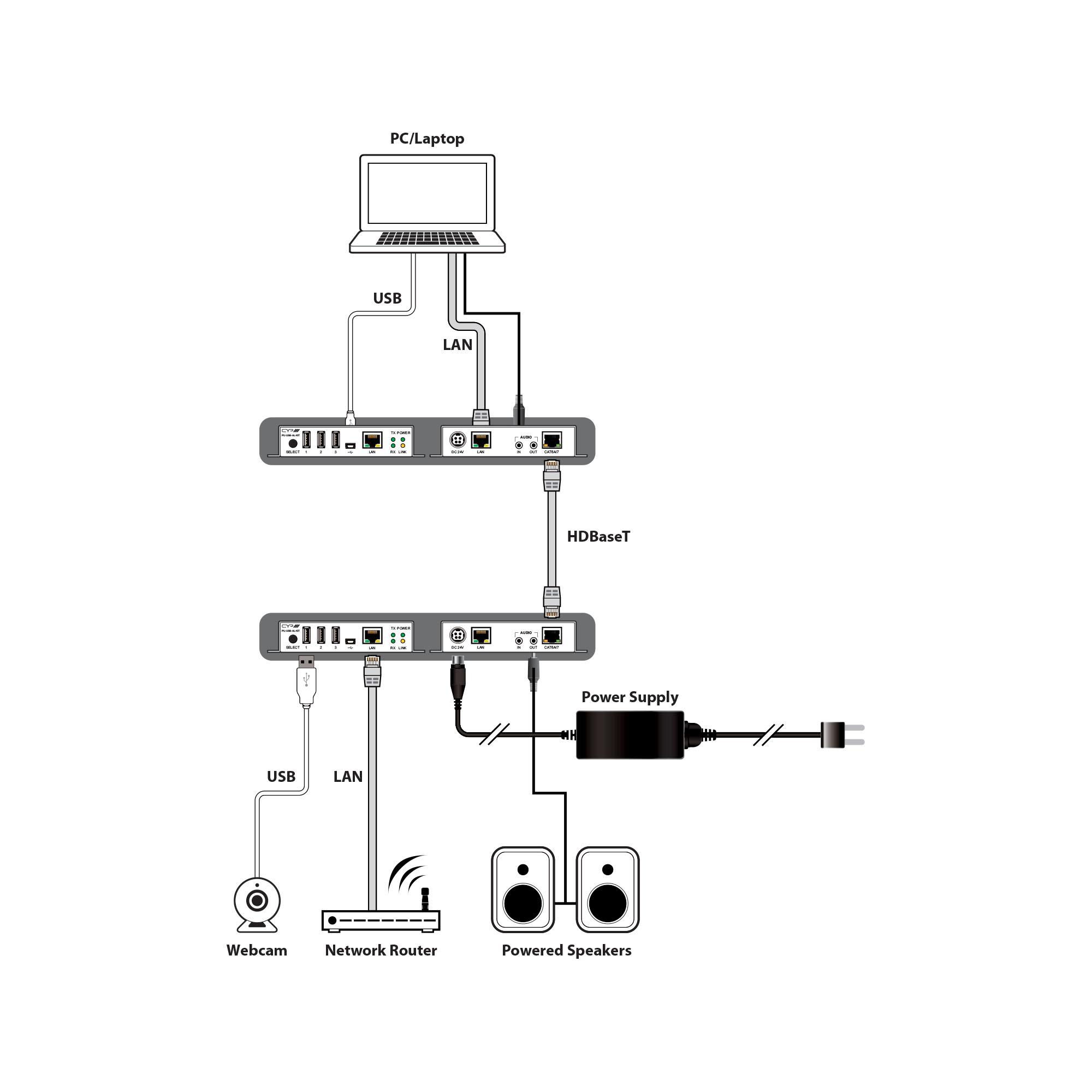 Lösningen består av 2 st PU-USB-AL-enheter (båda enheterna är alltså både sändare och mottagare, s.k. transcievers). Anslutningen mellan dem utgörs av en standard CAT6/7 nätverkskabel med dubbelriktad PoC (power over cable), vilket gör att valbar sida av systemet kan strömförsörjas, underlättar för att få en snygg installation.