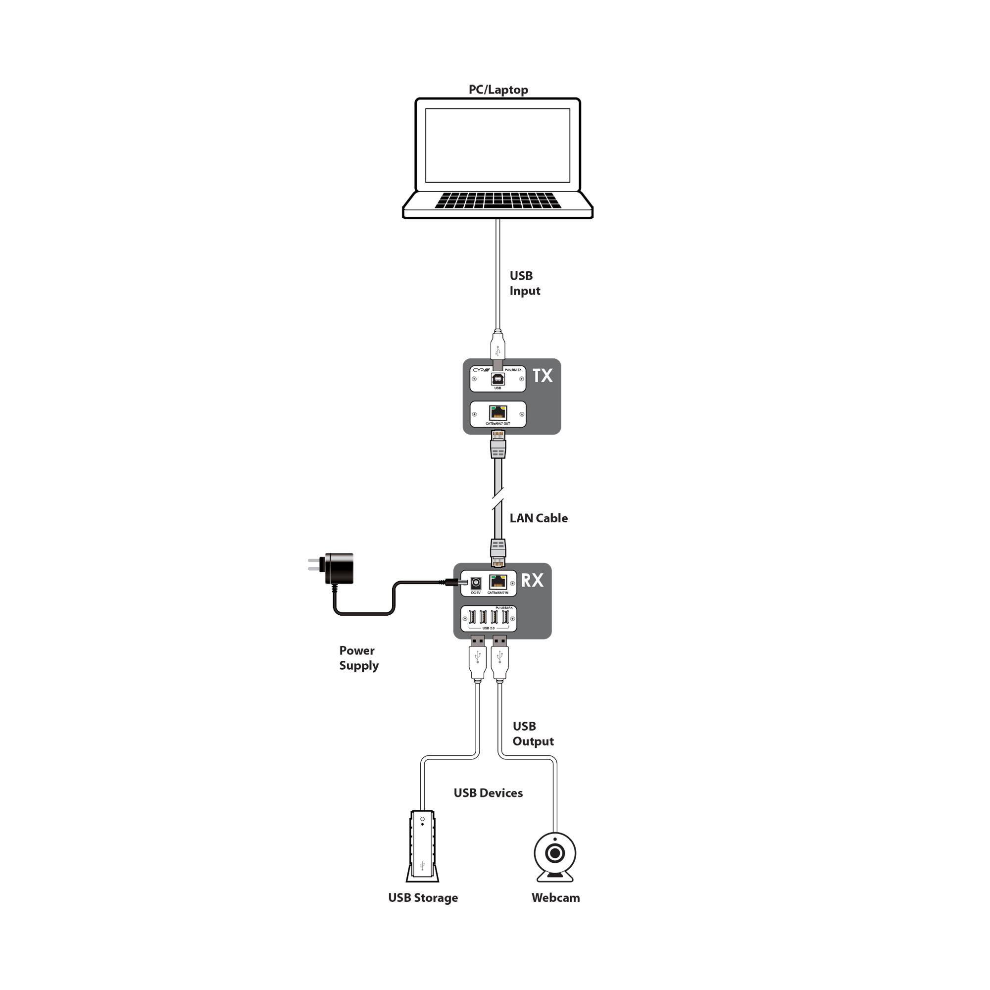 Via en standard nätverkskabel CAT5e eller bättre kan USB 2.0 data skickas upp till 50 meter med högkvalitativa, okomprimerade dataströmmar för alla applikationer. Anslutning för 1 PC (host) och upp till 4 enheter (devices), allt i ett kompakt men robust chassi.