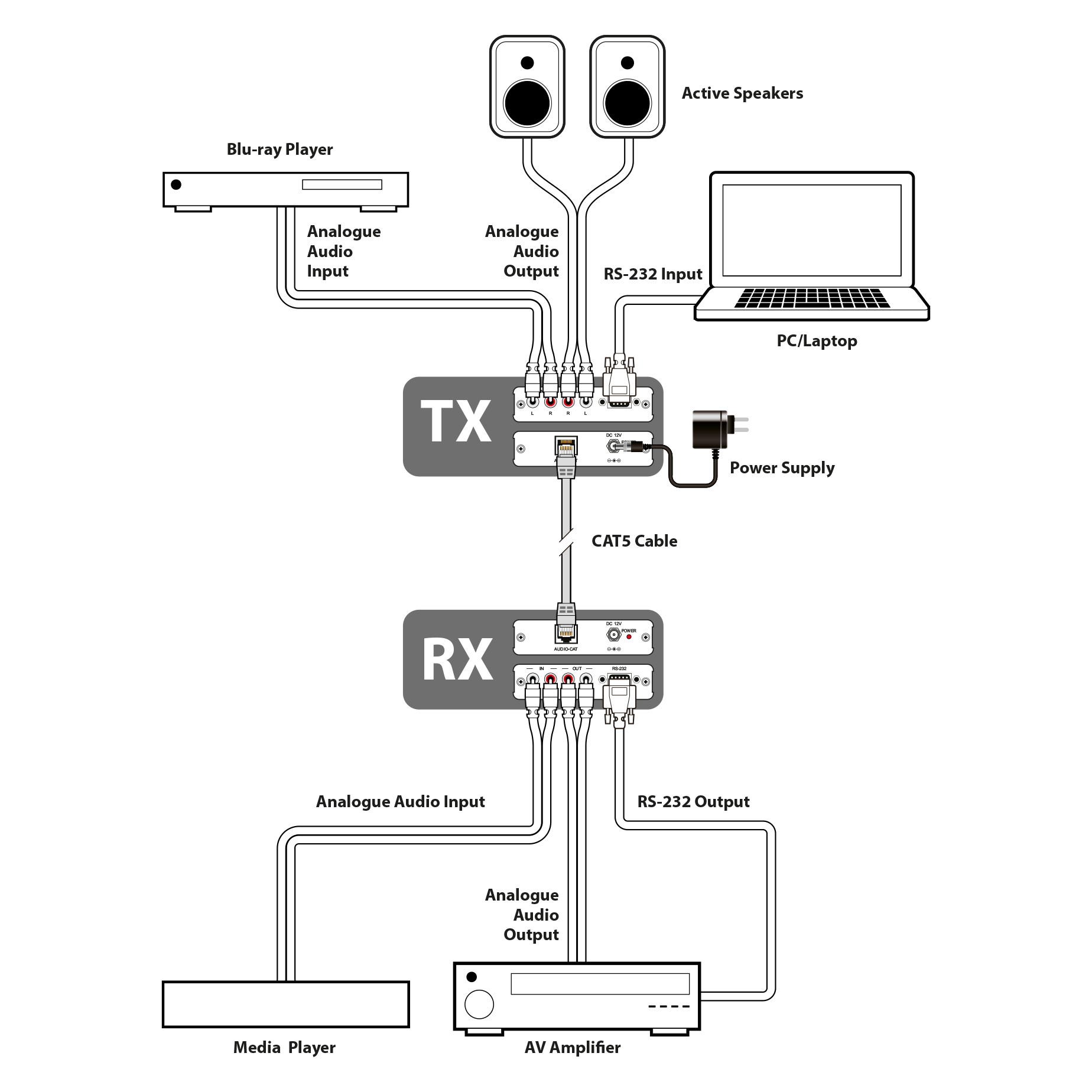 En extra fördel är att den har RS-232 pass-through, vilket möjliggör styrning av anslutna enheter. Funktionen Power over CAT (PoC) kan användas i båda ändar, vilket innebär att man kan strömförsörja antingen sändaren eller mottagaren utan behov av ytterligare en strömadapter.