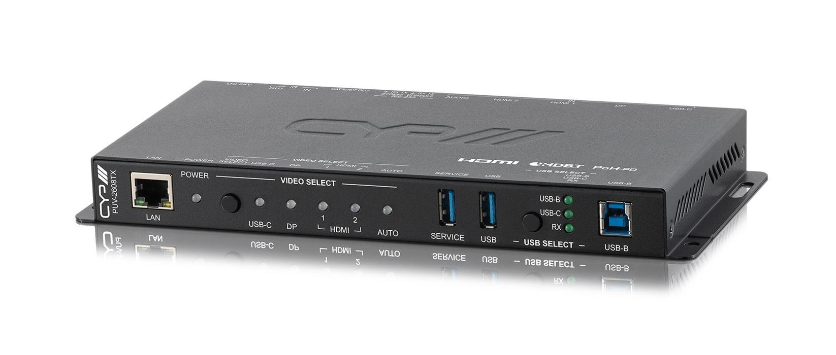 PUV-2608TX är mycket mer än en sändare (transmitter) för HDBaseT2 signaler - här hittar vi dessutom en avancerad bildväxel (switch) mellan de vanligaste anslutningstyperna, samt en USB 3.0-växel för att knyta enheter så som kamera, tangentbord och mus till de anslutna datorerna!