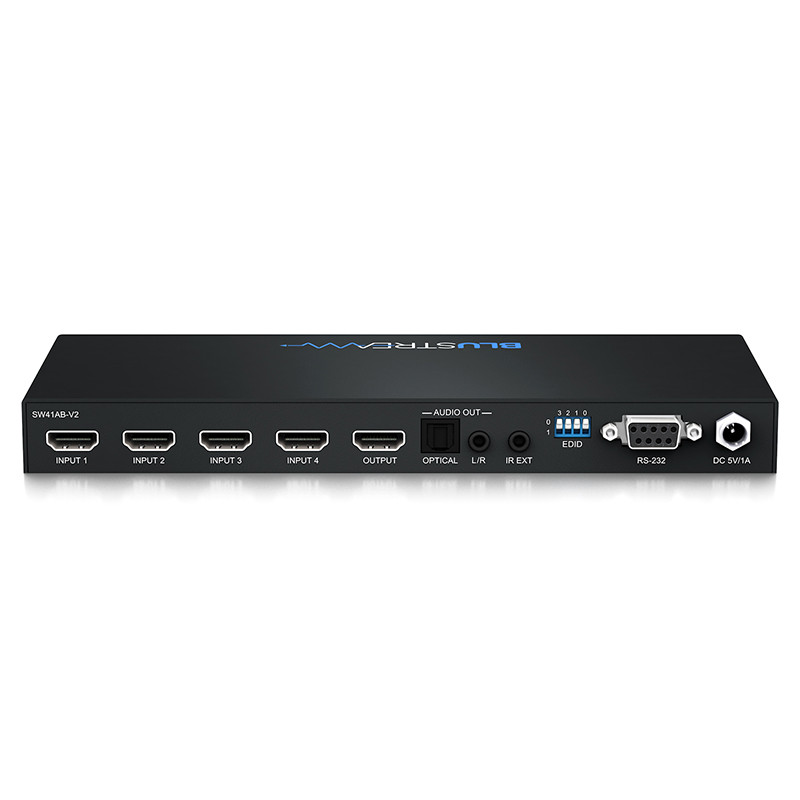 Blustream SW41AB-V2 är en HDMI-switch med 4 ingångar och 1 utgång. Switchen stödjer full HDMI 2.0 (4K @60Hz 4:4:4) och HDCP 2.2. SW41AB-V2 har dessutom s.k. audio breakout för att enkelt kunna "tappa av" ljudet till en ljudanläggning.