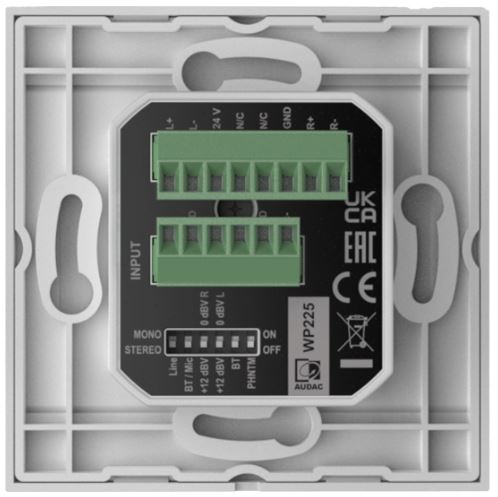 Audac WP225/W är en universal anslutningspanel med balanserad utgång, avsedd att anslutas till valfri line-ingång. Panelen är försedd med en balanserad mikrofoningång, en 3,5mm stereo line-ingång (individuella volymreglage) samt en Bluetooth-mottagare/pairing-knapp med LED-indikator (som indikerar "redan ansluten" eller pairing-läge). Panelens Bluetooth-ID kan ändras i siffror och bokstäver för lättare identifiering. (Separat app för Android: Audac Bluetooth rename ID).