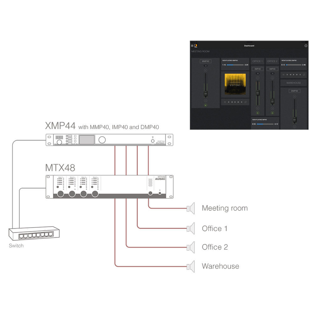 Med mer statiska ljudkällor kan XMP44 givetvis arbeta helt stand-alone, men med strömmande moduler (Spotify, SYB, radio) så finns ofta behovet att kunna välja och ändra: Modulerna kan då enkelt styras och integreras i Audacs kompetenta styrsystem via LAN, Audac Touch: XMP44 är också RS-232 kompatibel.